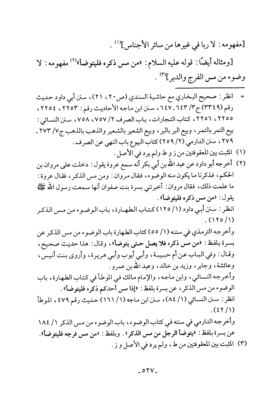 (¬2) أخرجه أبو داود عن عبد الله بن أبي بكر أنه سمع عروة يقول: دخلت على مروان بن الحكم، فذكرنا ما يكون منه الوضوء، فقال مروان: ومن مس الذكر، فقال عروة: ما علمت ذلك، فقال مروان: أخبرتني بسرة بنت صفوان أنها سمعت رسول الله - صلى الله عليه وسلم - يقول: "من مس ذكره فليتوضأ".