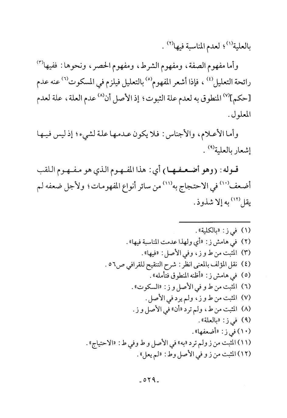 وأما مفهوم الصفة، ومفهوم الشرط، ومفهوم الحصر، ونحوها: ففيها (¬3) رائحة التعليل (¬4)، فإذا أشعر المفهوم (¬5) بالتعليل فيلزم في المسكوت (¬6) عنه عدم [حكم] (¬7) المنطوق به لعدم علة الثبوت؛ إذ الأصل أن (¬8) عدم العلة، علة لعدم المعلول.