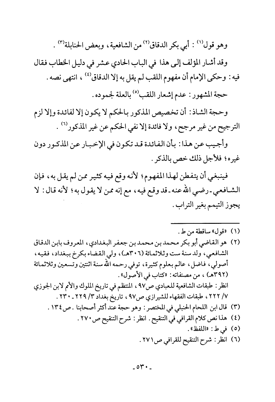 وقد أشار المؤلف إلى هذا في الباب الحادي عشر في دليل الخطاب فقال فيه: وحكى الإمام أن مفهوم اللقب لم يقل به إلا الدقاق (¬4)، انتهى نصه.