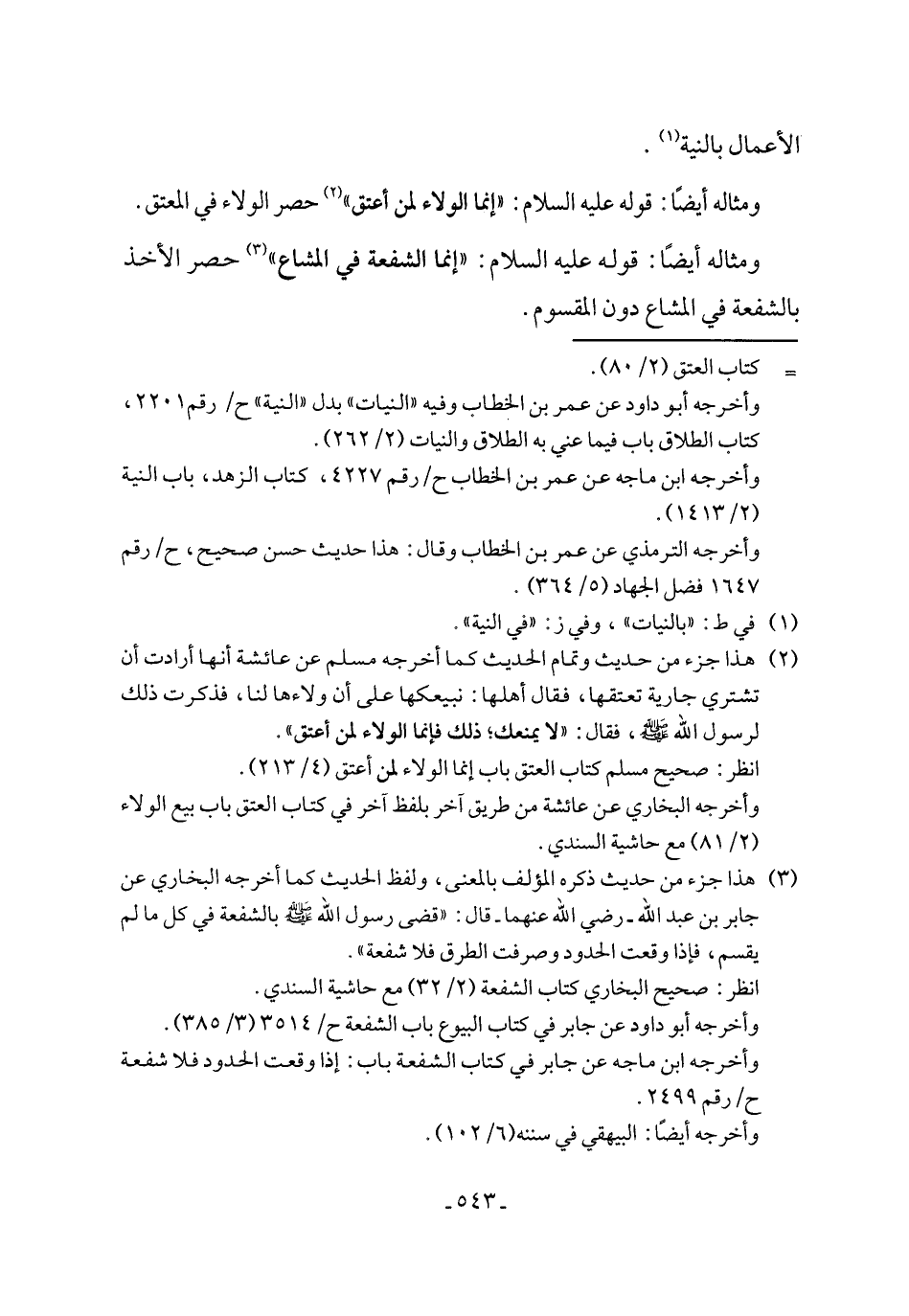 (¬3) هذا جزء من حديث ذكره المؤلف بالمعنى، ولفظ الحديث كما أخرجه البخاري عن جابر بن عبد الله - رضي الله عنهما - قال: "قضى رسول الله - صلى الله عليه وسلم - بالشفعة في كل ما لم يقسم، فإذا وقعت الحدود وصرفت الطرق فلا شفعة".
