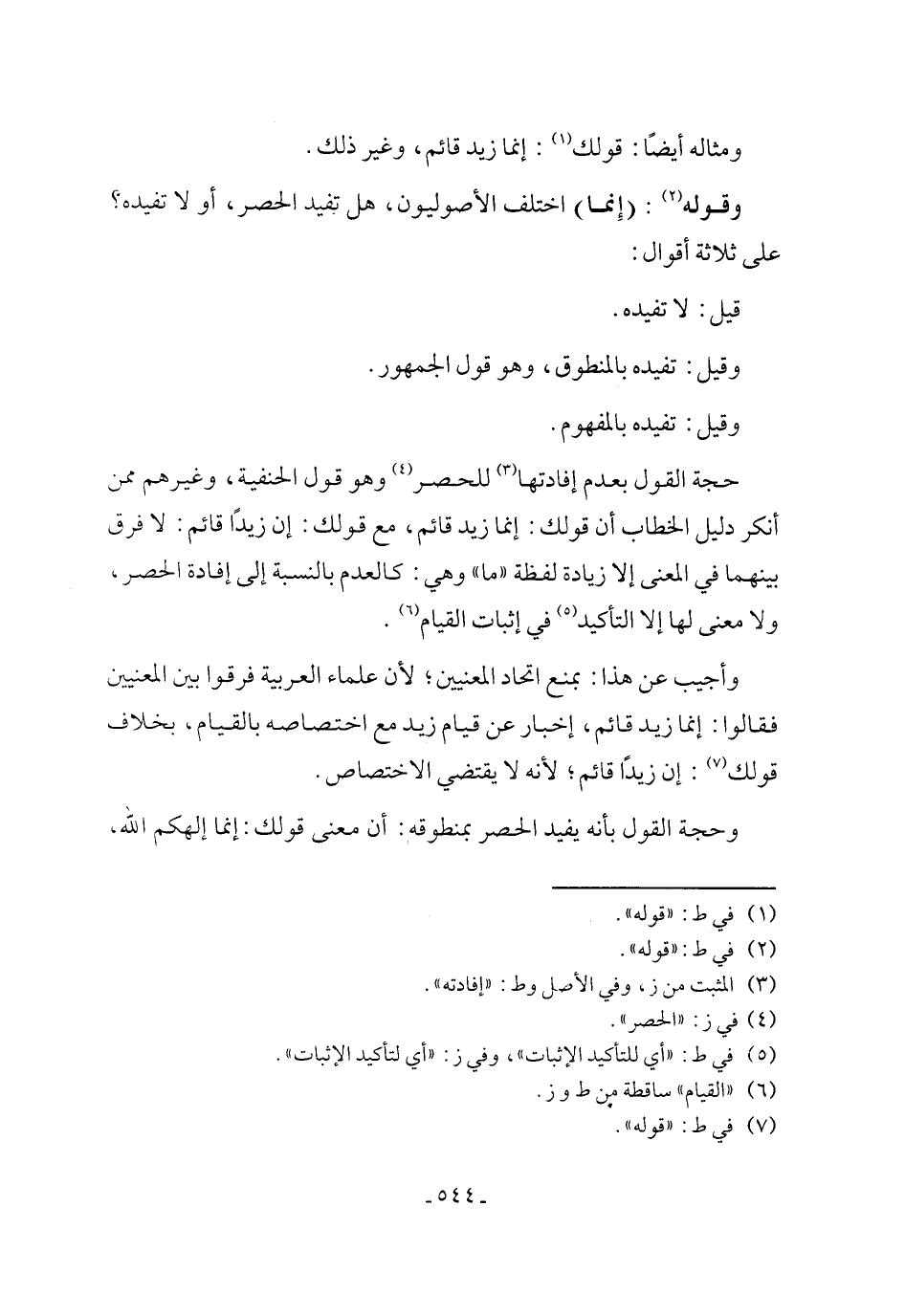 حجة القول بعدم إفادتها (¬3) للحصر (¬4) وهو قول الحنفية، وغيرهم ممن أنكر دليل الخطاب أن قولك: إنما زيد قائم، مع قولك: إن زيدًا قائم: لا فرق بينهما في المعنى إلا زيادة لفظة "ما" وهي: كالعدم بالنسبة إلى إفادة الحصر، ولا معنى لها إلا التأكيد (¬5) في إثبات القيام (¬6).