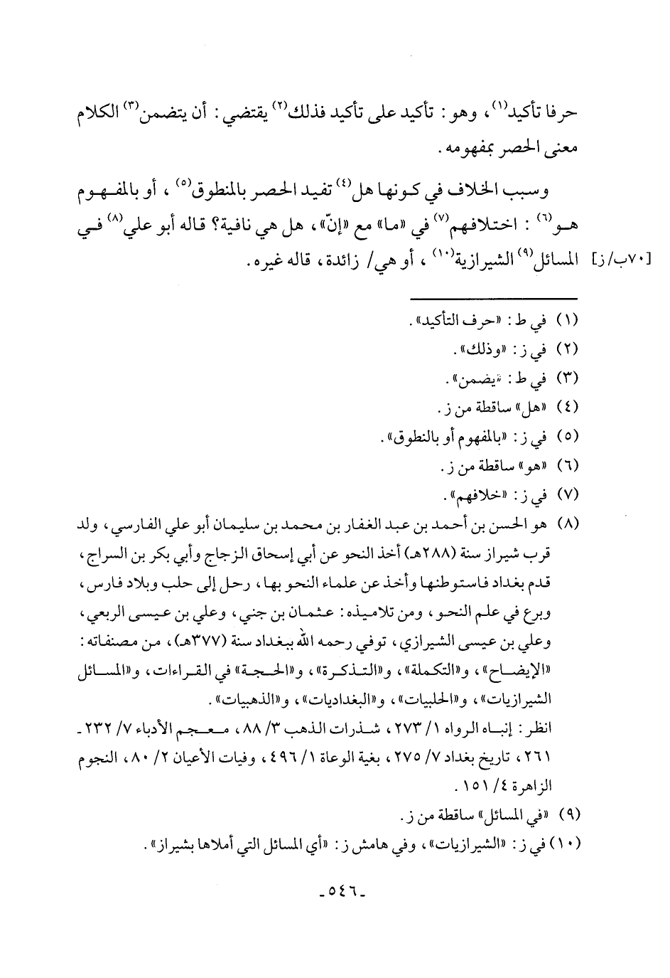 (¬8) هو الحسن بن أحمد بن عبد الغفار بن محمد بن سليمان أبو علي الفارسي، ولد قرب شيراز سنة (288 هـ) أخذ النحو عن أبي إسحاق الزجاج وأبي بكر بن السراج، قدم بغداد فاستوطنها وأخذ عن علماء النحو بها، رحل إلى حلب وبلاد فارس، وبرع في علم النحو، ومن تلاميذه: عثمان بن جني، وعلي بن عيسى الربعي، وعلي بن عيسى الشيرازي، توفي رحمه الله ببغداد سنة (377 هـ)، من مصنفاته: "الإيضاح"، و"التكملة"، و"التذكرة"، و"الحجة" في القراءات، و"المسائل الشيرازيات"، و"الحلبيات"، و"البغداديات"، و"الذهبيات".
