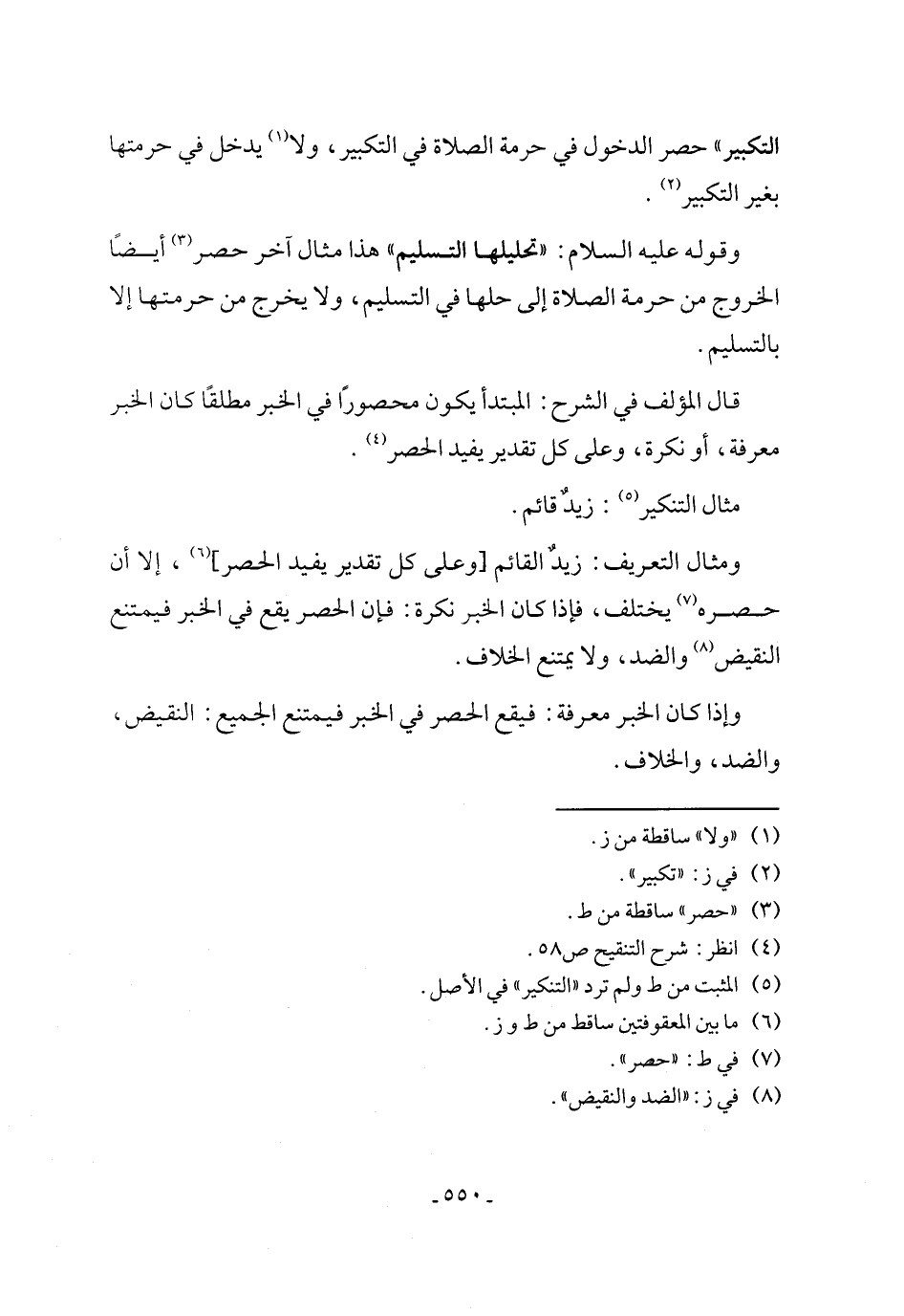 ومثال التعريف: زيدٌ القائم [وعلى كل تقدير يفيد الحصر] (¬6)، إلا أن حصره (¬7) يختلف، فإذا كان الخبر نكرة: فإن الحصر يقع في الخبر فيمتنع النقيض (¬8) والضد، ولا يمتنع الخلاف.