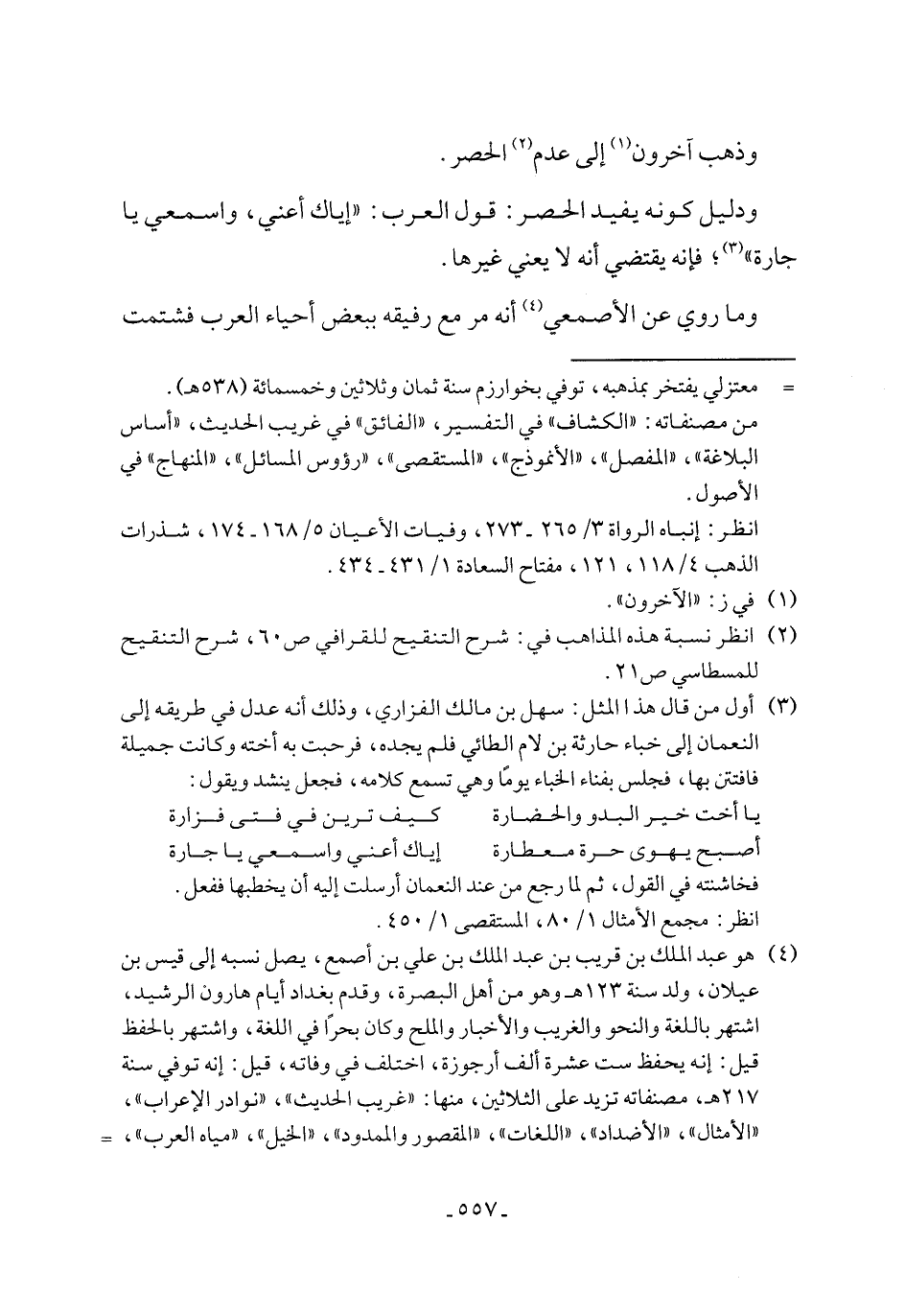 (¬4) هو عبد الملك بن قريب بن عبد الملك بن علي بن أصمع، يصل نسبه إلى قيس بن عيلان، ولد سنة 123 هـ وهو من أهل البصرة، وقدم بغداد أيام هارون الرشيد، اشتهر باللغة والنحو والغريب والأخبار والملح وكان بحرًا في اللغة، واشتهر بالحفظ قيل: إنه يحفظ ست عشرة ألف أرجوزة، اختلف في وفاته، قيل: إنه توفي سنة 217 هـ, مصنفاته تزيد على الثلاثين، منها: "غريب الحديث"، "نوادر الإعراب"، "الأمثال"، "الأضداد"، "اللغات"، "المقصور والممدود"، "الخيل"، "مياه العرب"، =