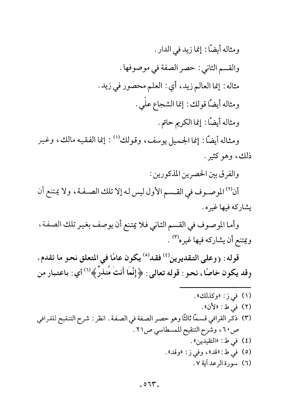 (¬3) ذكر القرافي قسمًا ثالثًا وهو حصر الصفة في الصفة. انظر: شرح التنقيح للقرافي ص 60، وشرح التنقيح للمسطاسي ص 21.