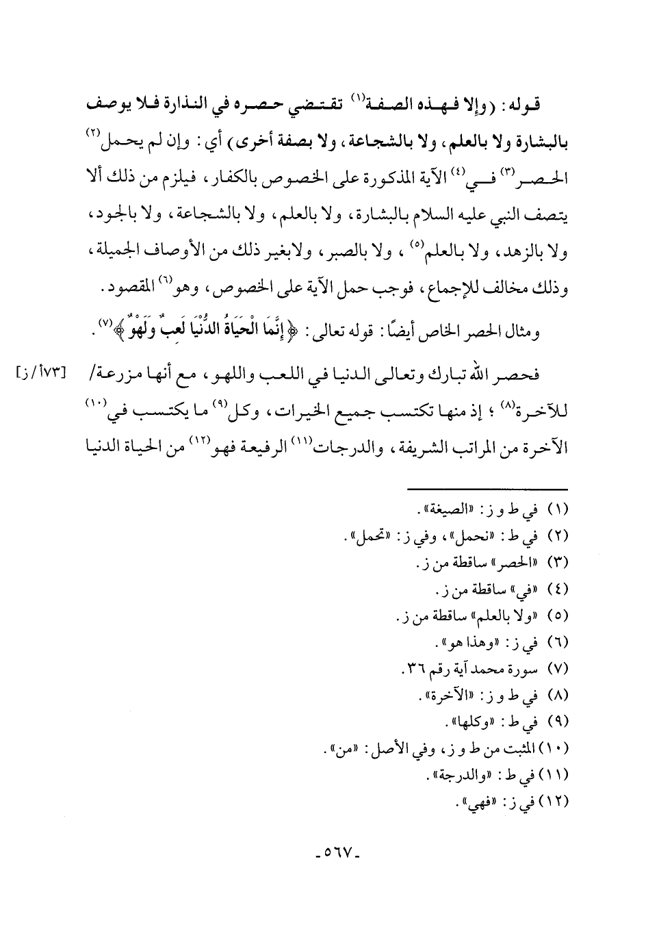 قوله: (وإِلا فهذه الصفة (¬1) تقتضي حصره في النذارة فلا يوصف بالبشارة ولا بالعلم، ولا بالشجاعة، ولا بصفة أخرى) أي: وإن لم يحمل (¬2) الحصر (¬3) في (¬4) الآية المذكورة على الخصوص بالكفار، فيلزم من ذلك ألا يتصف النبي عليه السلام بالبشارة، ولا بالعلم، ولا بالشجاعة، ولا بالجود، ولا بالزهد، ولا بالعلم (¬5)، ولا بالصبر، ولا بغير ذلك من الأوصاف الجميلة، وذلك مخالف للإجماع، فوجب حمل الآية على الخصوص، وهو (¬6) المقصود.