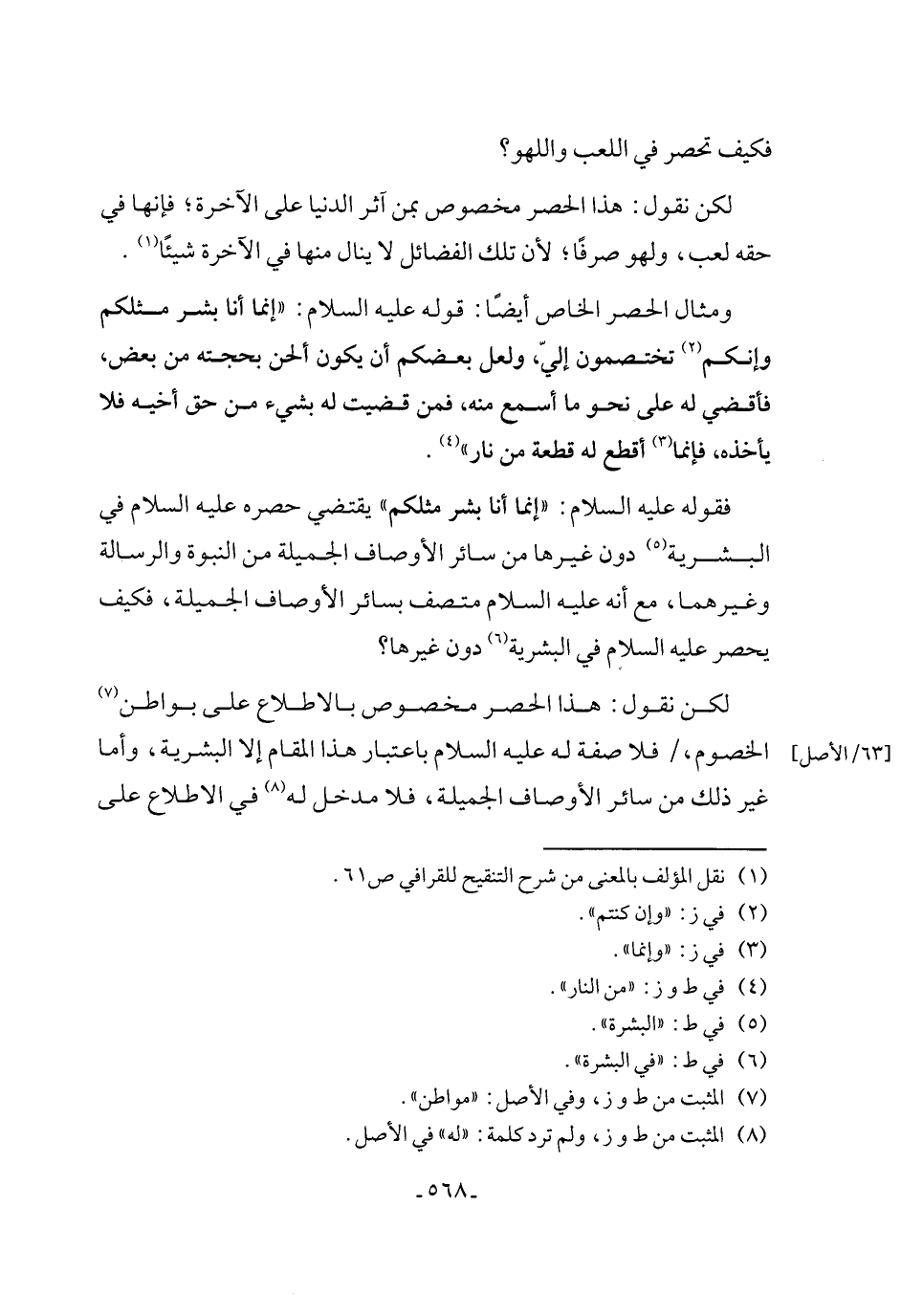 فقوله عليه السلام: "إنما أنا بشر مثلكم" يقتضي حصره عليه السلام في البشرية (¬5) دون غيرها من سائر الأوصاف الجميلة من النبوة والرسالة وغيرهما، مع أنه عليه السلام متصف بسائر الأوصاف الجميلة، فكيف يحصر عليه السلام في البشرية (¬6) دون غيرها؟