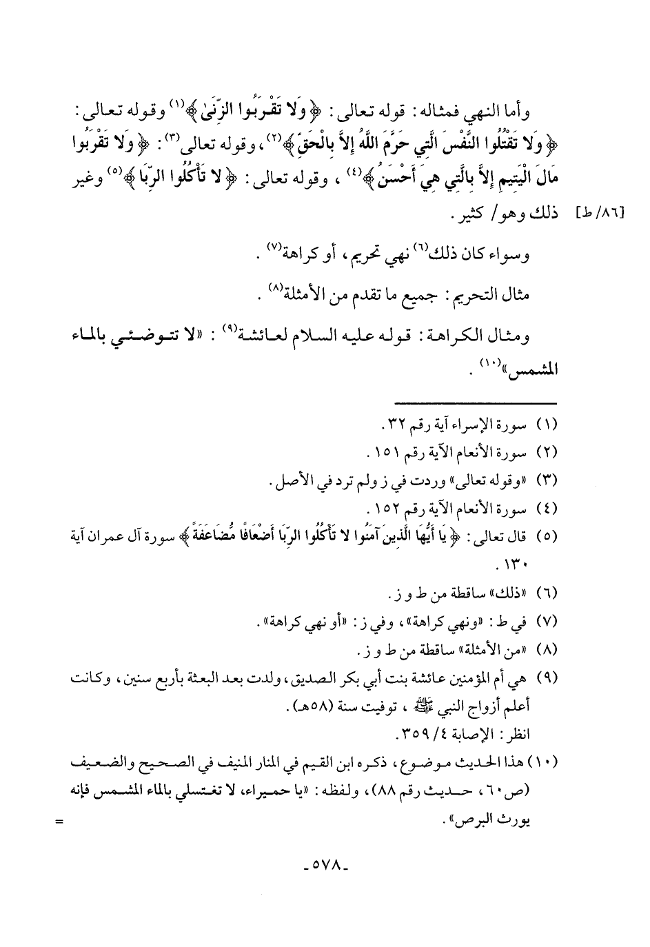 وأما النهي فمثاله: قوله تعالى: {وَلَا تَقْرَبُوا الزِّنَا} (¬1) وقوله تعالى: {وَلَا تَقْتُلُوا النَّفْسَ الَّتِي حَرَّمَ اللَّهُ إلا بِالْحَقِّ} (¬2)، وقوله تعالى (¬3): {وَلَا تَقْرَبُوا مَالَ الْيَتِيمِ إلا بِالَّتِي هِيَ أَحْسَنُ} (¬4)، وقوله تعالى: {لَا تَأْكُلُوا الرِّبَا} (¬5) وغير ذلك وهو كثير.