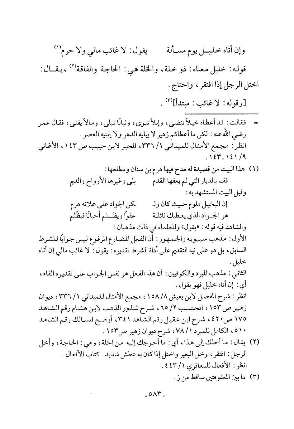 الأول: مذهب سيبويه والجمهور: أن الفعل المضارع المرفوع ليس جوابًا للشرط السابق، بل هو على نية التقديم على أداة الشرط تقديره: يقول: لا غائب مالي إن أتاه خليل.