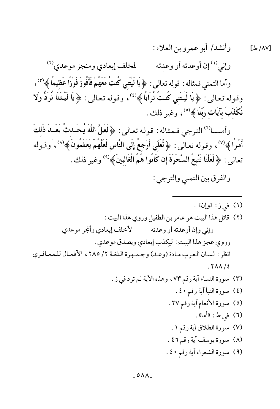 وأما التمني فمثاله: قوله تعالى: {يَالَيْتَنِي كُنْتُ مَعَهُمْ فَأَفُوزَ فَوْزًا عَظِيمًا} (¬3)، وقوله تعالى: {يَالَيْتَنِي كُنْتُ تُرَابًا} (¬4)، وقوله تعالى: {يَالَيْتَنَا نُرَدُّ وَلَا نُكَذِّبَ بِآيَاتِ رَبِّنَا} (¬5)، وغير ذلك.