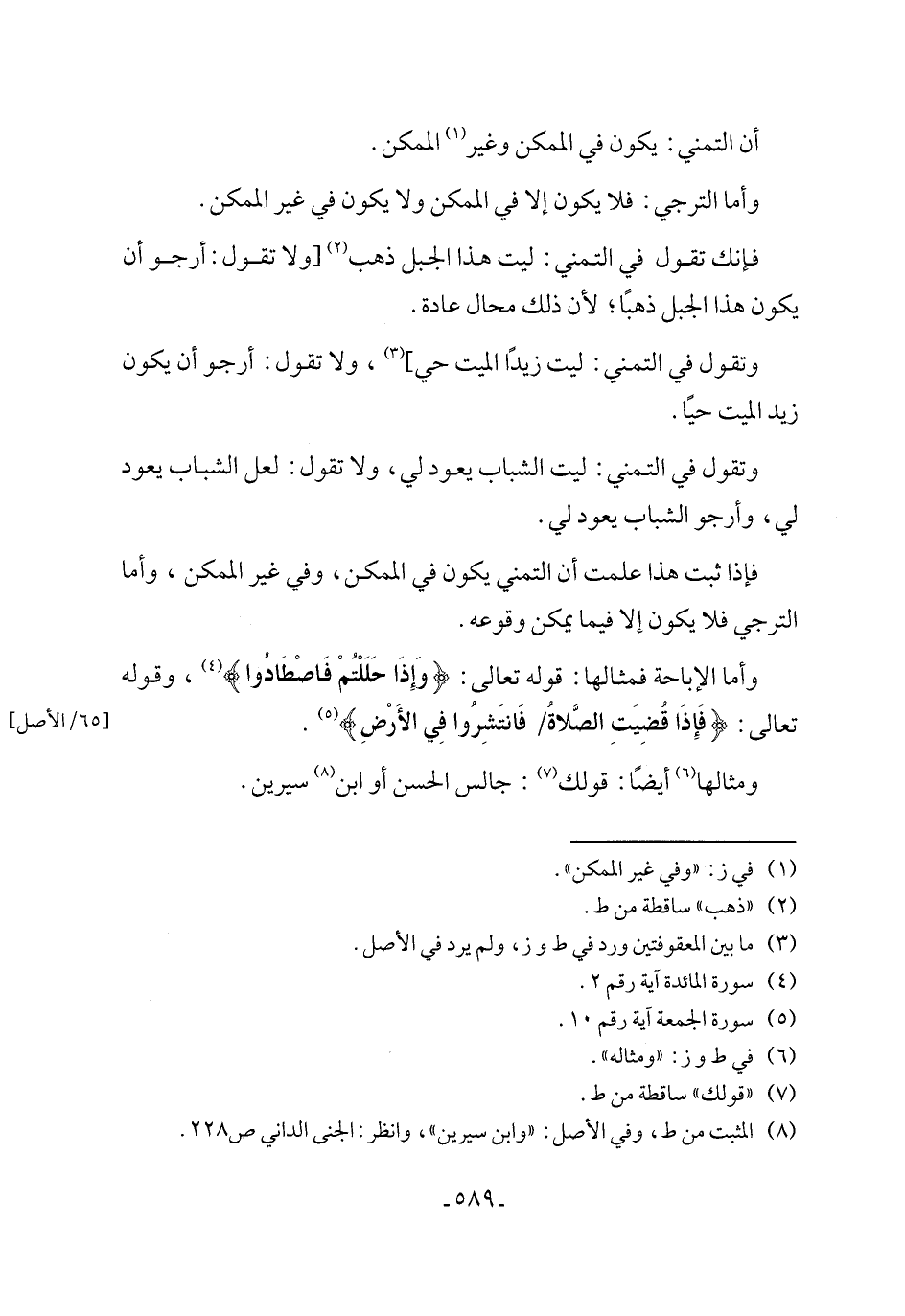 أن التمني: يكون في الممكن وغير (¬1) الممكن.