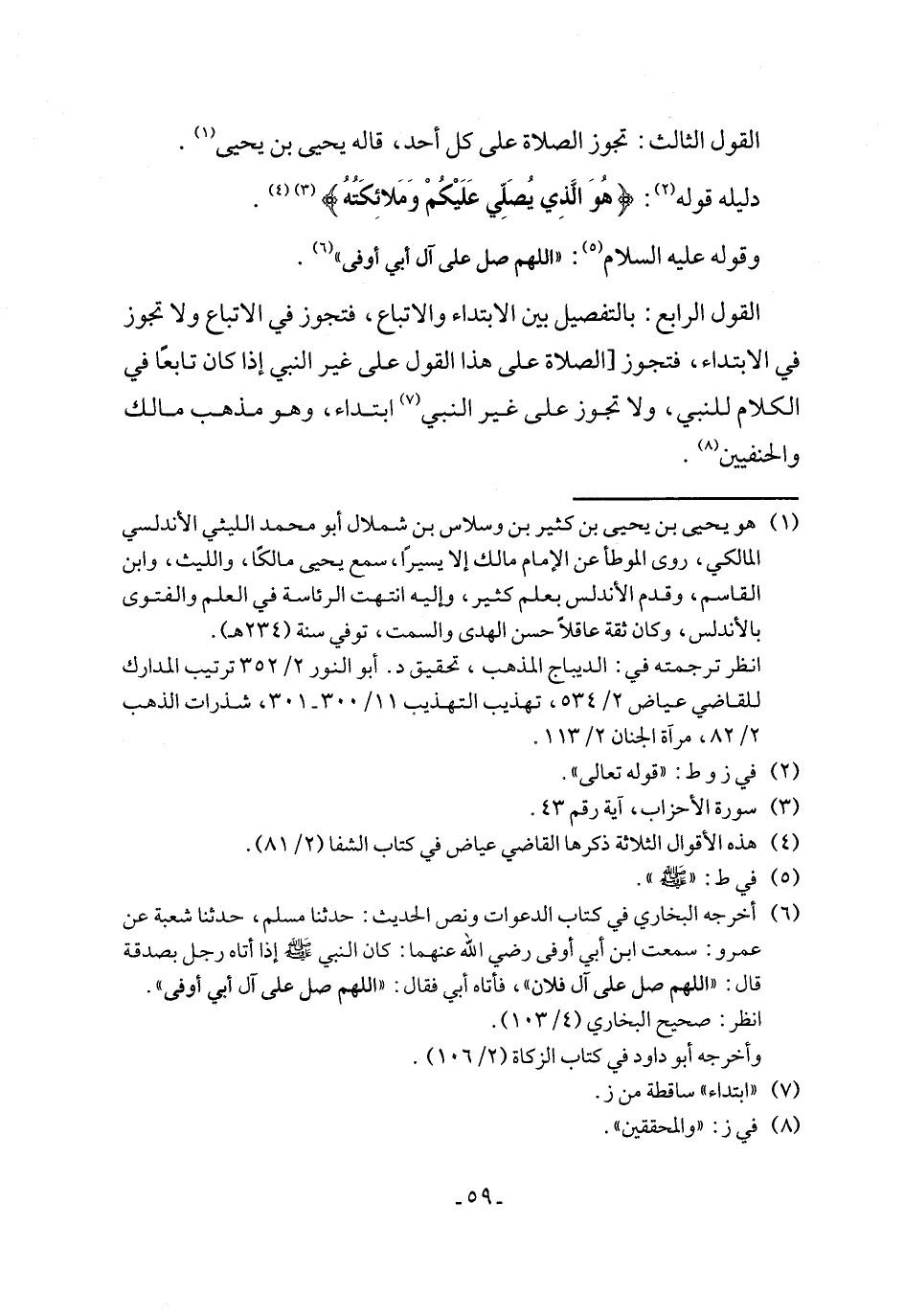 القول الرابع: بالتفصيل بين الابتداء والاتباع، فتجوز في الاتباع ولا تجوز في الابتداء، فتجوز [الصلاة على هذا القول على غير النبي إذا كان تابعًا في الكلام للنبي، ولا تجوز على غير النبي (¬7) ابتداء، وهو مذهب مالك والحنفيين (¬8).