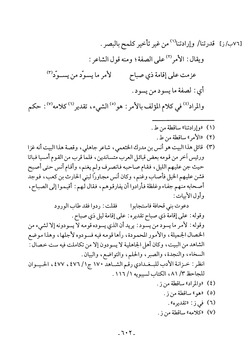(¬3) قائل هذا البيت هو أنس بن مدرك الخثعمي، شاعر جاهلي، وقصة هذا البيت أنه غزا ورئيس آخر من قومه بعض قبائل العرب متساندين، فلما قرب من القوم أمسيا فباتا حيث جن عليهم الليل، فقام صاحبه فانصرف ولم يغنم، وأقام أنس حتى أصبح فشن عليهم الخيل فأصاب وغنم، وكان أنس مجاورًا لبني الحارث بن كعب، فوجد أصحابه منهم جفاء وغلظة فأرادوا أن يفارقوهم، فقال لهم: أقيموا إلى الصباح، وأول الأبيات: