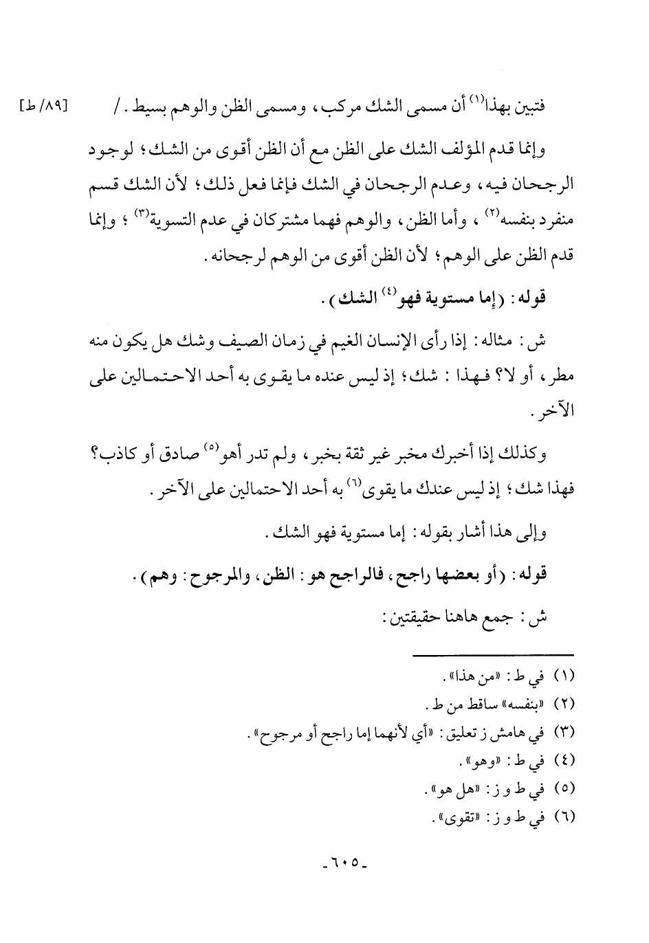 وإنما قدم المؤلف الشك على الظن مع أن الظن أقوى من الشك؛ لوجود الرجحان فيه، وعدم الرجحان في الشك فإنما فعل ذلك؛ لأن الشك قسم منفرد بنفسه (¬2)، وأما الظن، والوهم فهما مشتركان في عدم التسوية (¬3)؛ وإنما قدم الظن على الوهم؛ لأن الظن أقوى من الوهم لرجحانه.