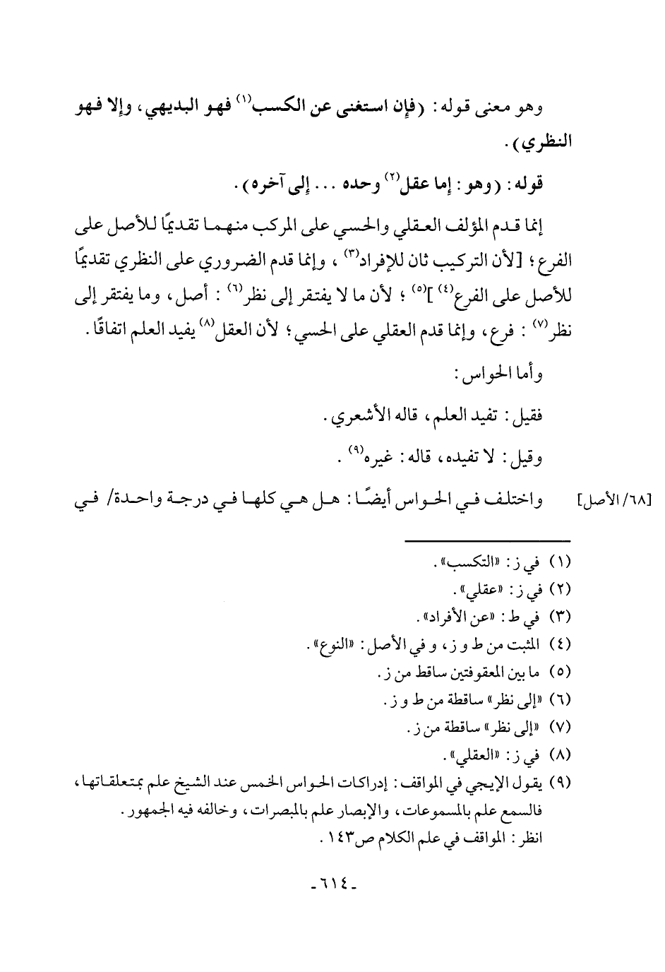 (¬9) يقول الإيجي في المواقف: إدراكات الحواس الخمس عند الشيخ علم بمتعلقاتها، فالسمع علم بالمسموعات، والإبصار علم بالمبصرات، وخالفه فيه الجمهور.
