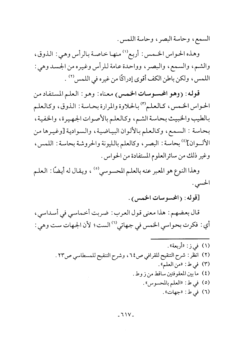قوله: (وهو المحسوسات الخمس) معناه: وهو: العلم المستفاد من الحواس الخمس، كالعلم (¬3) بالحلاوة والمرارة بحاسة: الذوق، وكالعلم بالطيب والخبيث بحاسة الشم، وكالعلم بالأصوات الجهيرة، والخفية، بحاسة: السمع، وكالعلم بالألوان البياضية، والسوادية [وغيرها من الألوان] (¬4) بحاسة: البصر، وكالعلم بالليونة والحروشة بحاسة: اللمس، وغير ذلك من سائر العلوم المستفادة من الحواس.