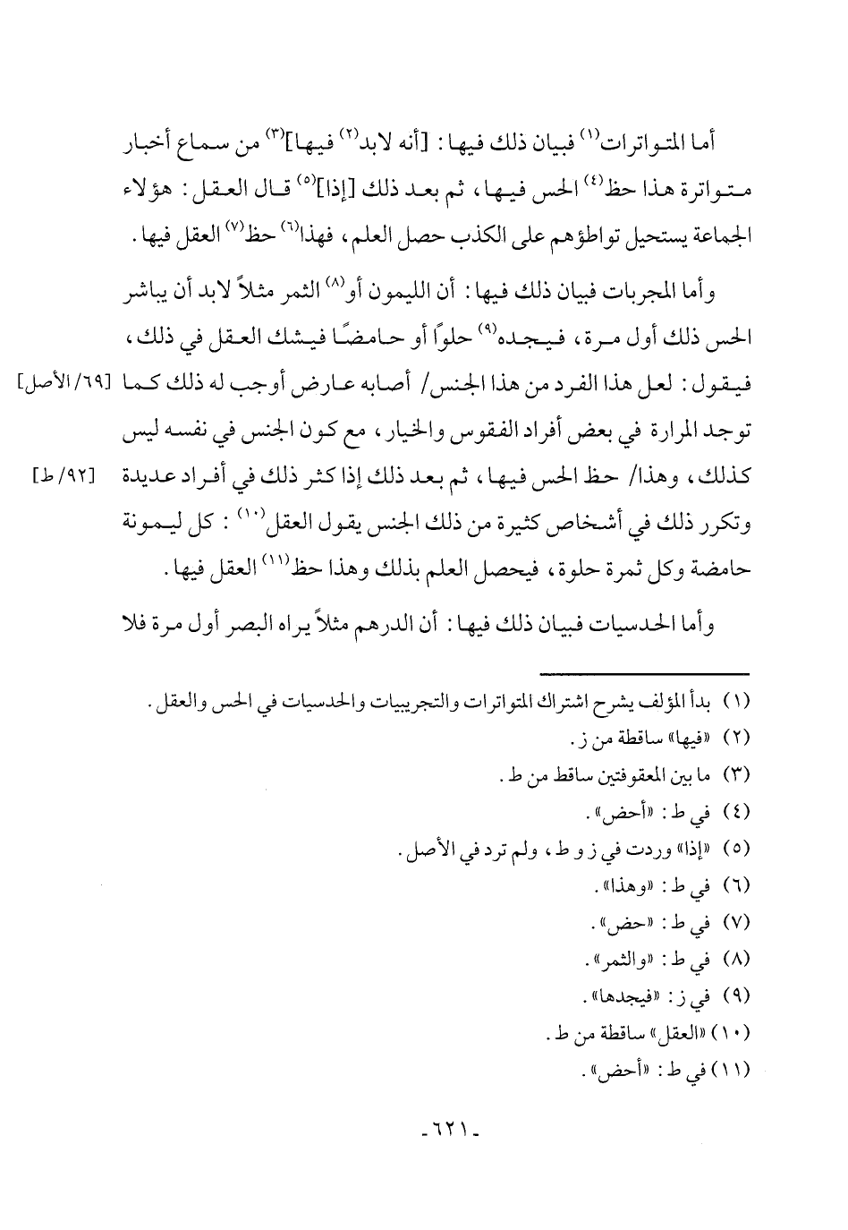 (¬1) بدأ المؤلف يشرح اشتراك المتواترات والتجريبيات والحدسيات في الحس والعقل.