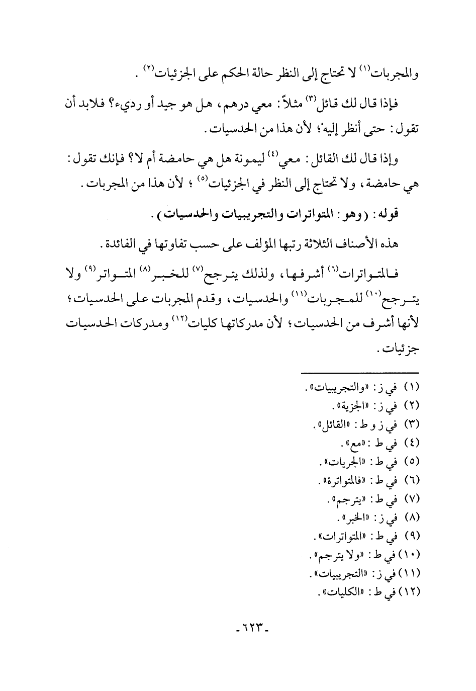 فالمتواترات (¬6) أشرفها، ولذلك يترجح (¬7) للخبر (¬8) المتواتر (¬9) ولا يترجح (¬10) للمجربات (¬11) والحدسيات، وقدم المجربات على الحدسيات؛ لأنها أشرف من الحدسيات؛ لأن مدركاتها كليات (¬12) ومدركات الحدسيات جزئيات.