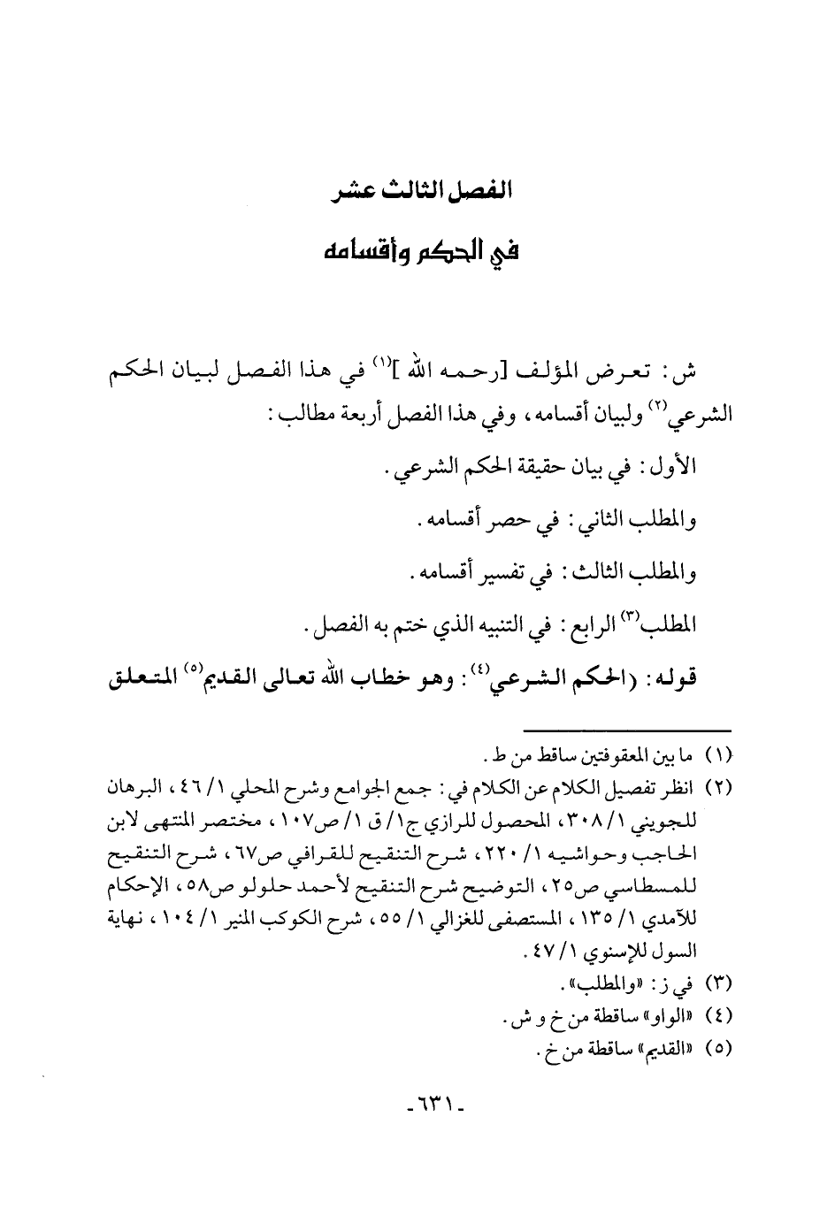 ش: تعرض المؤلف [رحمه الله] (¬1) في هذا الفصل لبيان الحكم الشرعي (¬2) ولبيان أقسامه، وفي هذا الفصل أربعة مطالب: