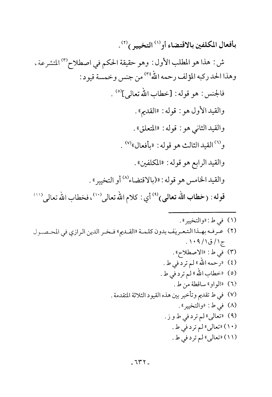 ش: هذا هو المطلب الأول: وهو حقيقة الحكم في اصطلاح (¬3) المتشرعة، وهذا الحد ركبه المؤلف رحمه الله (¬4) من جنس وخمسة قيود: