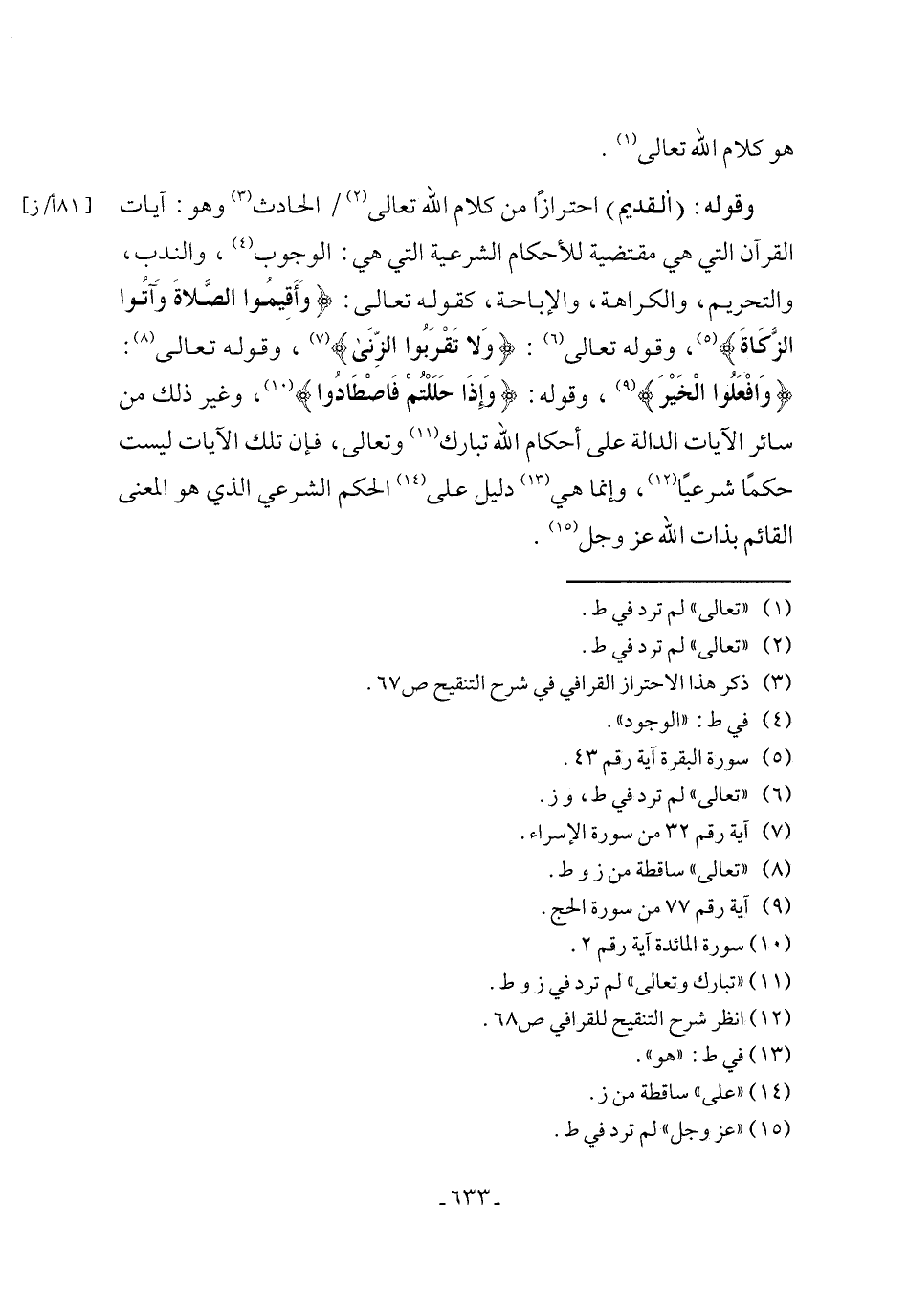 وقوله: (القديم) احترازًا من كلام الله تعالى (¬2) الحادث (¬3) وهو: آيات القرآن التي هي مقتضية للأحكام الشرعية التي هي: الوجوب (¬4)، والندب، والتحريم، والكراهة، والإباحة، كقوله تعالى: {وَأَقِيمُوا الصَّلَاةَ وَآتُوا الزَّكَاةَ} (¬5)، وقوله تعالى (¬6): {وَلَا تَقْرَبُوا الزِّنَا} (¬7)، وقوله تعالى (¬8): {وَافْعَلُوا الْخَيْرَ} (¬9)، وقوله: {وَإِذَا حَلَلْتُمْ فَاصْطَادُوا} (¬10)، وغير ذلك من سائر الآيات الدالة على أحكام الله تبارك (¬11) وتعالى، فإن تلك الآيات ليست حكمًا شرعيًا (¬12)، وإنما هي (¬13) دليل على (¬14) الحكم الشرعي الذي هو المعنى القائم بذات الله عز وجل (¬15).