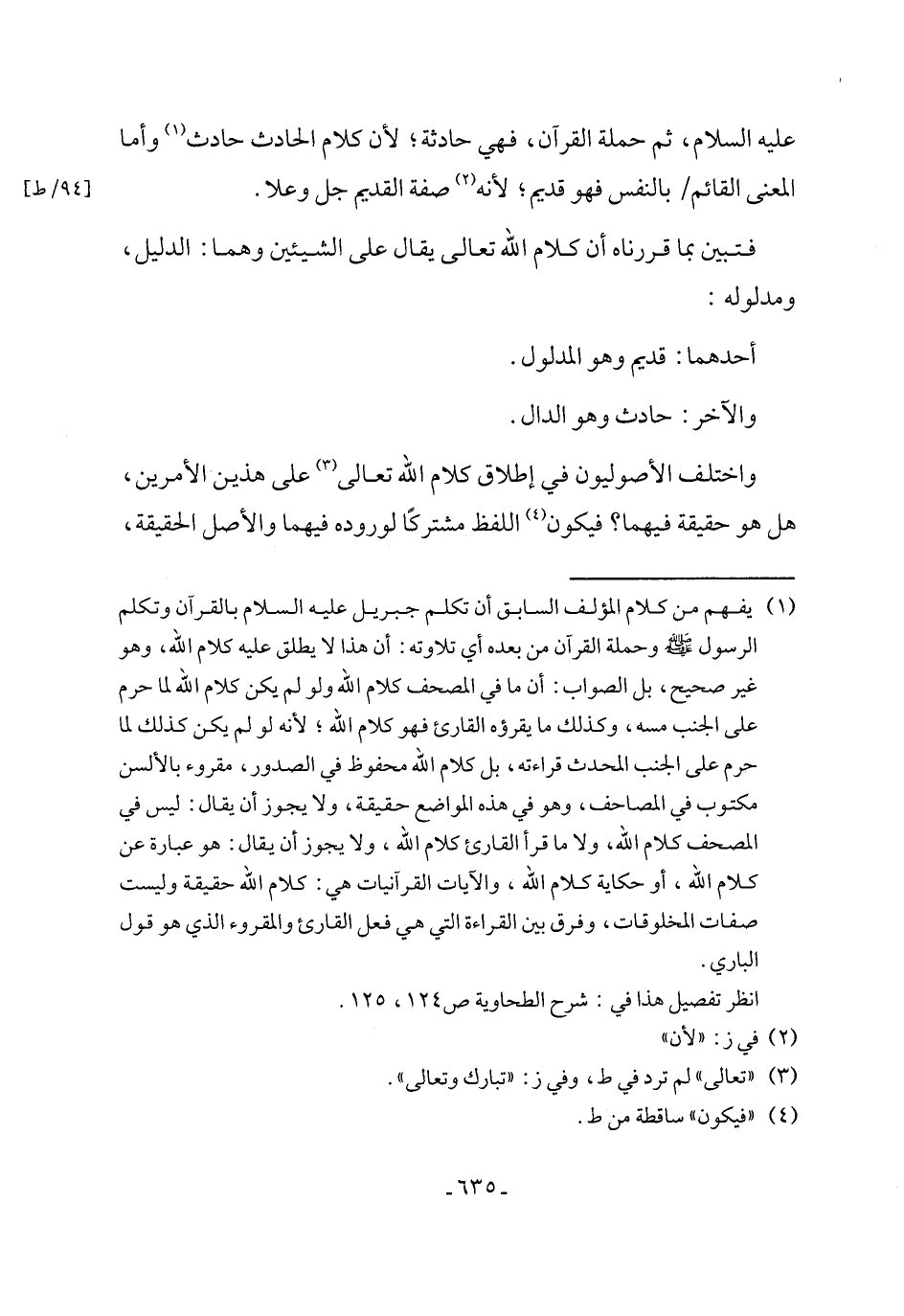 (¬1) يفهم من كلام المؤلف السابق أن تكلم جبريل عليه السلام بالقرآن وتكلم الرسول - صلى الله عليه وسلم - وحملة القرآن من بعده أي تلاوته: أن هذا لا يطلق عليه كلام الله، وهو غير صحيح، بل الصواب: أن ما في المصحف كلام الله ولو لم يكن كلام الله لما حرم على الجنب مسه، وكذلك ما يقرؤه القارئ فهو كلام الله؛ لأنه لو لم يكن كذلك لما حرم على الجنب المحدث قراءته، بل كلام الله محفوظ في الصدور، مقروء بالألسن مكتوب في المصاحف، وهو في هذه المواضع حقيقة، ولا يجوز أن يقال: ليس في المصحف كلام الله، ولا ما قرأ القارئ كلام الله، ولا يجوز أن يقال: هو عبارة عن كلام الله، أو حكاية كلام الله، والآيات القرآنيات هي: كلام الله حقيقة وليست صفات المخلوقات، وفرق بين القراءة التي هي فعل القارئ والمقروء الذي هو قول الباري.