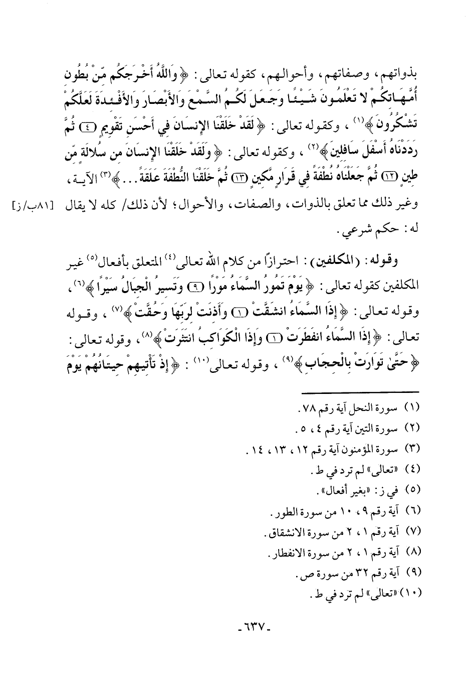 بذواتهم، وصفاتهم، وأحوالهم، كقوله تعالى: {وَاللَّهُ أَخْرَجَكُمْ مِنْ بُطُونِ أُمَّهَاتِكُمْ لَا تَعْلَمُونَ شَيْئًا وَجَعَلَ لَكُمُ السَّمْعَ وَالْأَبْصَارَ وَالْأَفْئِدَةَ لَعَلَّكُمْ تَشْكُرُونَ} (¬1)، وكقوله تعالى: {لَقَدْ خَلَقْنَا الْإِنْسَانَ فِي أَحْسَنِ تَقْوِيمٍ (4) ثُمَّ رَدَدْنَاهُ أَسْفَلَ سَافِلِينَ} (¬2)، وكقوله تعالى: {وَلَقَدْ خَلَقْنَا الْإِنْسَانَ مِنْ سُلَالَةٍ مِنْ طِينٍ (12) ثُمَّ جَعَلْنَاهُ نُطْفَةً فِي قَرَارٍ مَكِينٍ (13) ثُمَّ خَلَقْنَا النُّطْفَةَ عَلَقَةً ...} (¬3) الآية، وغير ذلك مما تعلق بالذوات، والصفات، والأحوال؛ لأن ذلك كله لا يقال له: حكم شرعي.