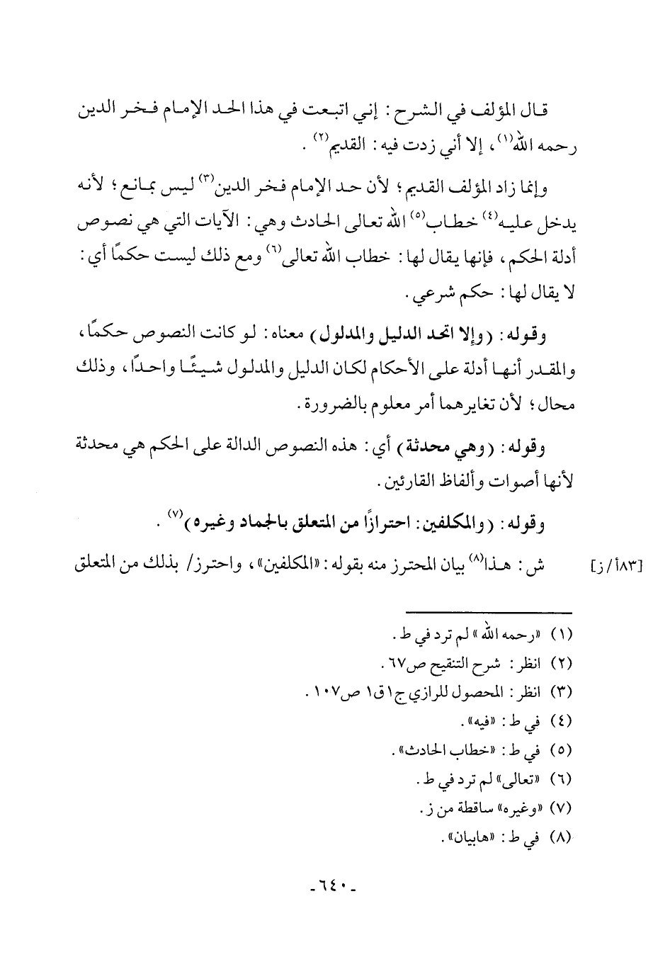 قال المؤلف في الشرح: إني اتبعت في هذا الحد الإمام فخر الدين رحمه الله (¬1)، إلا أني زدت فيه: القديم (¬2).