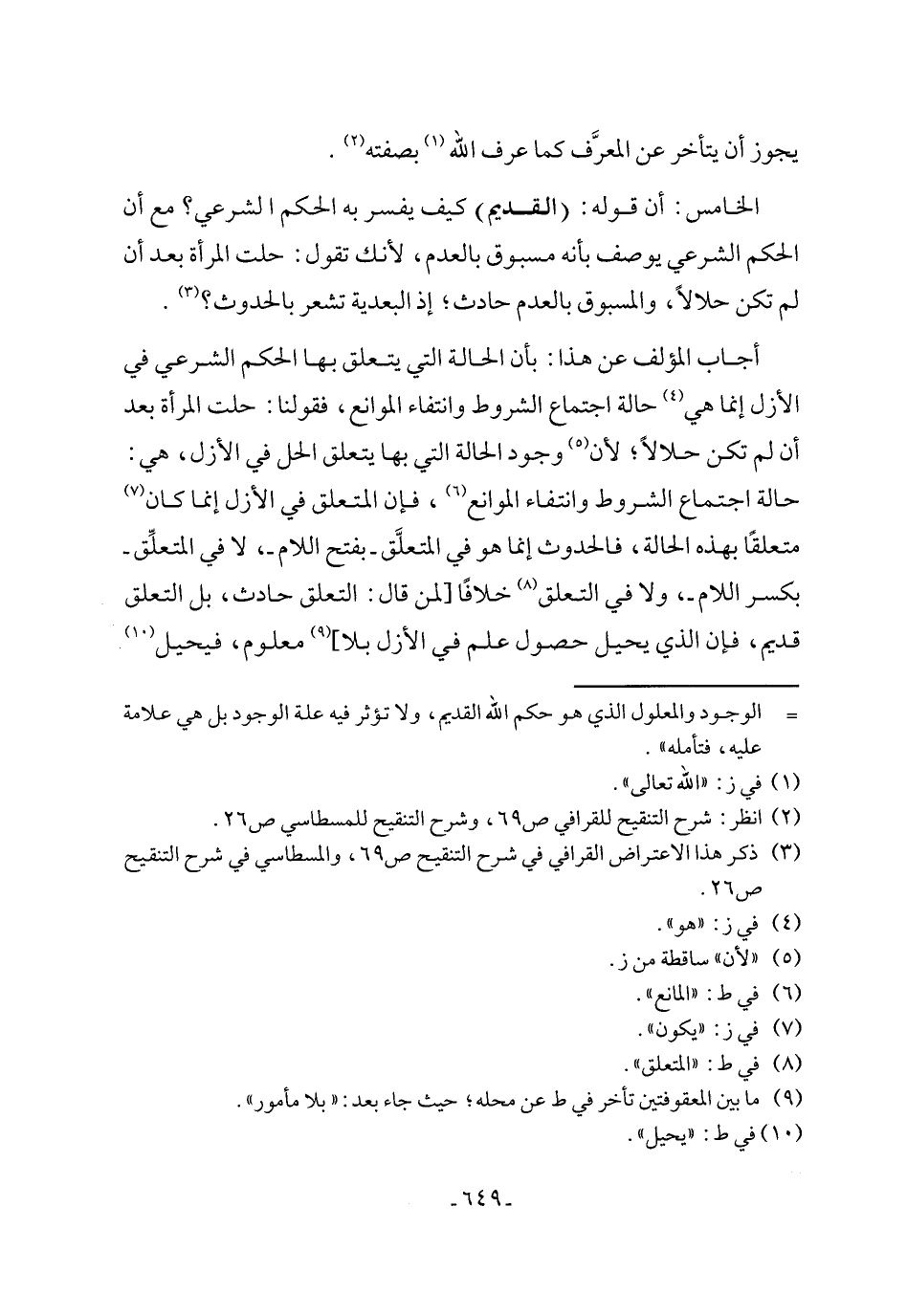 الخامس: أن قوله: (القديم) كيف يفسر به الحكم الشرعي؟ مع أن الحكم الشرعي يوصف بأنه مسبوق بالعدم، لأنك تقول: حلت المرأة بعد أن لم تكن حلالاً، والمسبوق بالعدم حادث؛ إذ البعدية تشعر بالحدوث؟ (¬3).