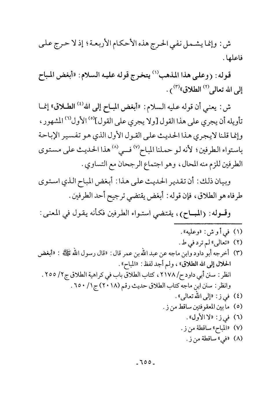 (¬3) أخرجه أَبو داود وابن ماجه عن عبد الله بن عمر قال: "قال رسول الله - صلى الله عليه وسلم -: "أبغض الحلال إلى الله الطلاق"، ولم أجد لفظ: "المباح".
