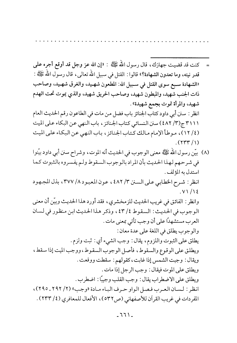 (8) بيّن رسول الله - صلى الله عليه وسلم - معنى الوجوب في الحديث أنه الموت، وشراح سنن أبي داود بيّنوا في شرحهم لهذا الحديث بأن المراد بالوجوب السقوط ولم يفسروه بالثبوت كما استدل به المؤلف.
