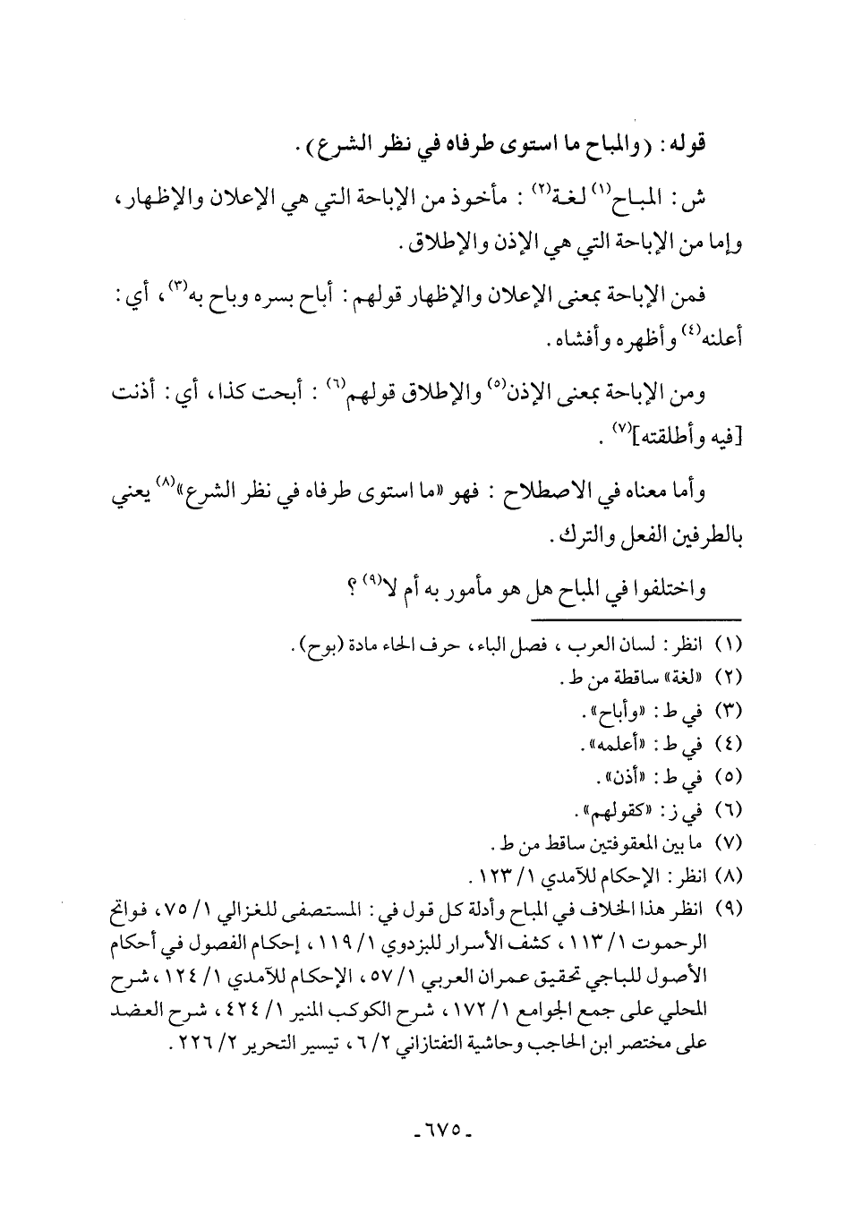(¬9) انظر هذا الخلاف في المباح وأدلة كل قول في: المستصفى للغزالي 1/ 75، فواتح الرحموت 1/ 113، كشف الأسرار للبزدوي 1/ 119، إحكام الفصول في أحكام الأصول للباجي تحقيق عمران العربي 1/ 57، الإحكام للآمدي 1/ 124، شرح المحلي على جمع الجوامع 1/ 172، شرح الكوكب المنير 1/ 424، شرح العضد على مختصر ابن الحاجب وحاشية التفتازاني 2/ 6، تيسير التحرير 2/ 226.
