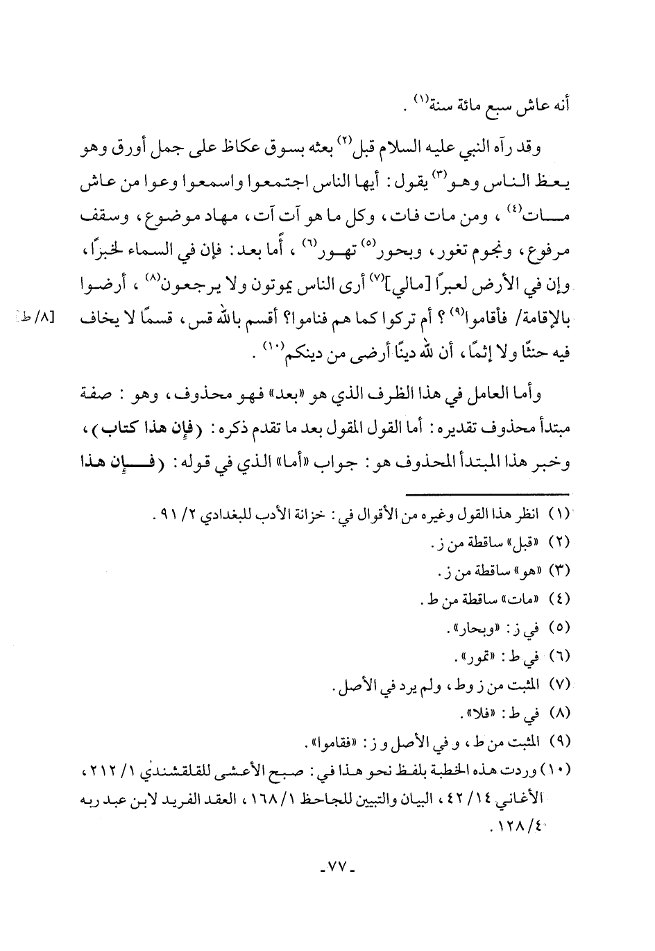 (¬10) وردت هذه الخطبة بلفظ نحو هذا في: صبح الأعشى للقلقشندي 1/ 212، الأغاني 14/ 42، البيان والتبيين للجاحظ 1/ 168، العقد الفريد لابن عبد ربه 4/ 128.