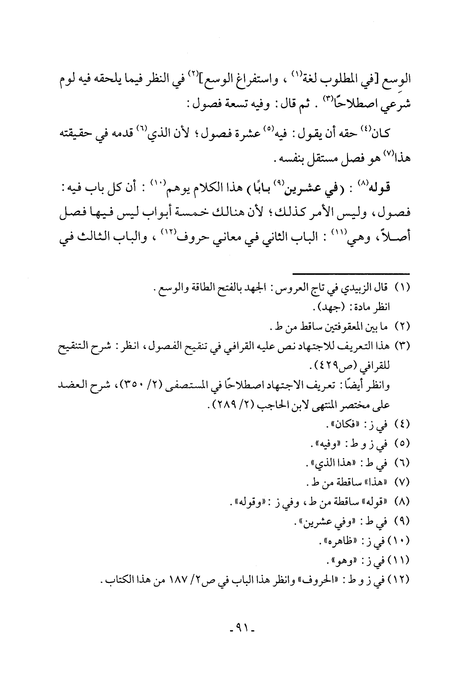 الوِسع [في المطلوب لغة (¬1)، واستفراغ الوسع] (¬2) في النظر فيما يلحقه فيه لوم شرعي اصطلاحًا (¬3). ثم قال: وفيه تسعة فصول: