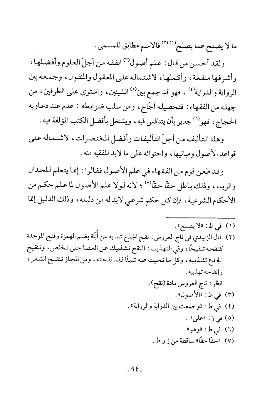 ولقد أحسن من قال: علم أصول (¬3) الفقه من أجلّ العلوم وأفضلها، وأشرفها منفعة، وأكملها، لاشتماله على المعقول والمنقول، وجمعه بين الرواية والدراية (¬4)، فهو قد جمع بين (¬5) الشيئين، واستوى على الطرفين، من جهله من الفقهاء: فتحصيله أجَاج، ومن سلب ضوابطه: عدم عند دعاويه الحجاج، فهو (¬6) جدير بأن يتنافس فيه، ويشتغل بأفضل الكتب المؤلفة فيه.