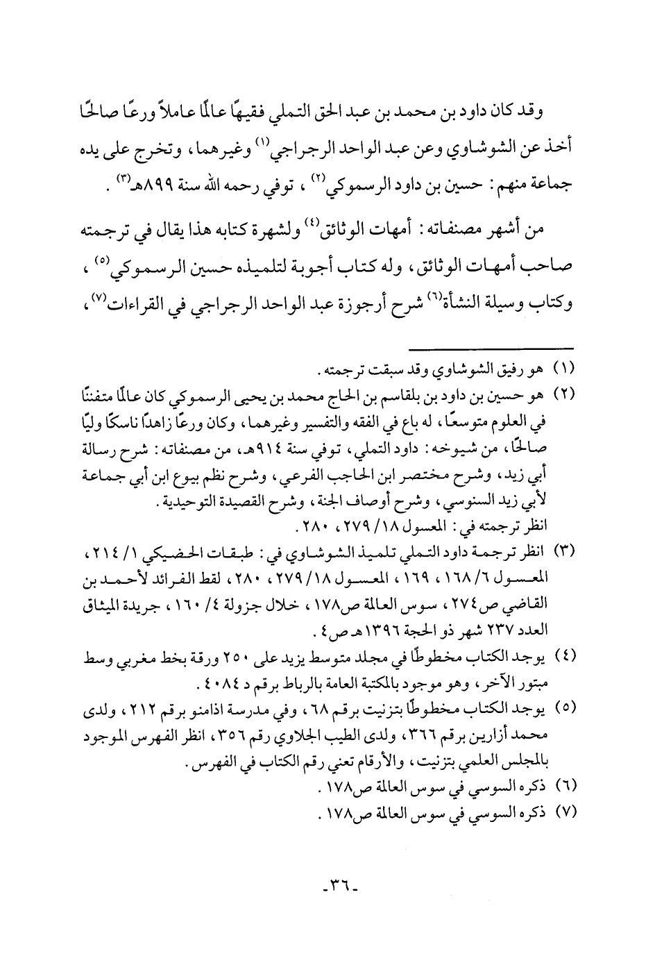 (¬3) انظر ترجمة داود التملي تلميذ الشوشاوي في: طبقات الحضيكي 1/ 214، المعسول 6/ 168، 169، المعسول 18/ 279، 280، لقط الفرائد لأحمد بن القاضي ص 274، سوس العالمة ص 178، خلال جزولة 4/ 160، جريدة الميثاق العدد 237 شهر ذو الحجة 1396 هـ ص 4.