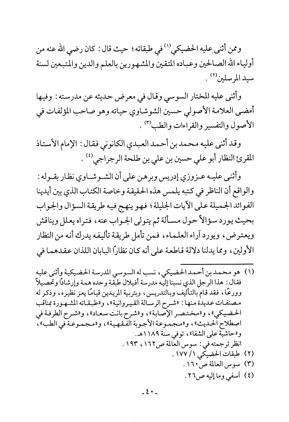 وأثنى عليه المختار السوسي وقال في معرض حديثه عن مدرسته: وفيها أمضى العلامة الأصولي حسين الشوشاوي حياته وهو صاحب المؤلفات في الأصول والتفسير والقراءات والطب (¬3).