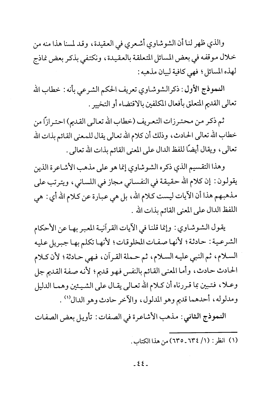 النموذج الأول: ذكرالشوشاوي تعريف الحكم الشرعي بأنه: خطاب الله تعالى القديم المتعلق بأفعال المكلفين بالاقتضاء أو التخيير.