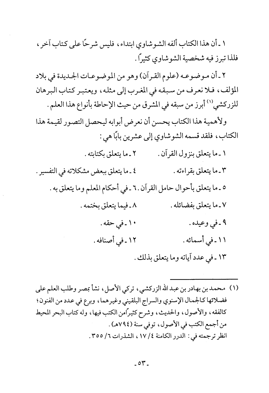 2 - أن موضوعه (علوم القرآن) وهو من الموضوعات الجديدة في بلاد المؤلف، فلا نعرف من سبقه في المغرب إلى مثله، ويعتبر كتاب البرهان للزركشي (¬1) أبرز من سبقه في المشرق من حيث الإحاطة بأنواع هذا العلم.