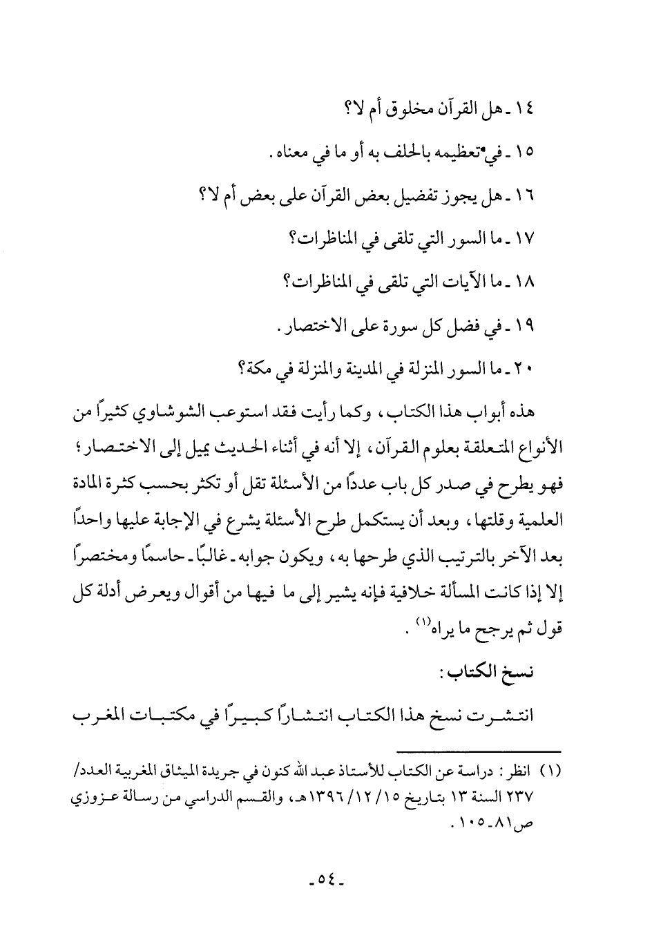 (¬1) انظر: دراسة عن الكتاب للأستاذ عبد الله كنون في جريدة الميثاق المغربية العدد/ 237 السنة 13 بتاريخ 15/ 12/ 1396 هـ، والقسم الدراسي من رسالة عزوزي ص 81 - 105.