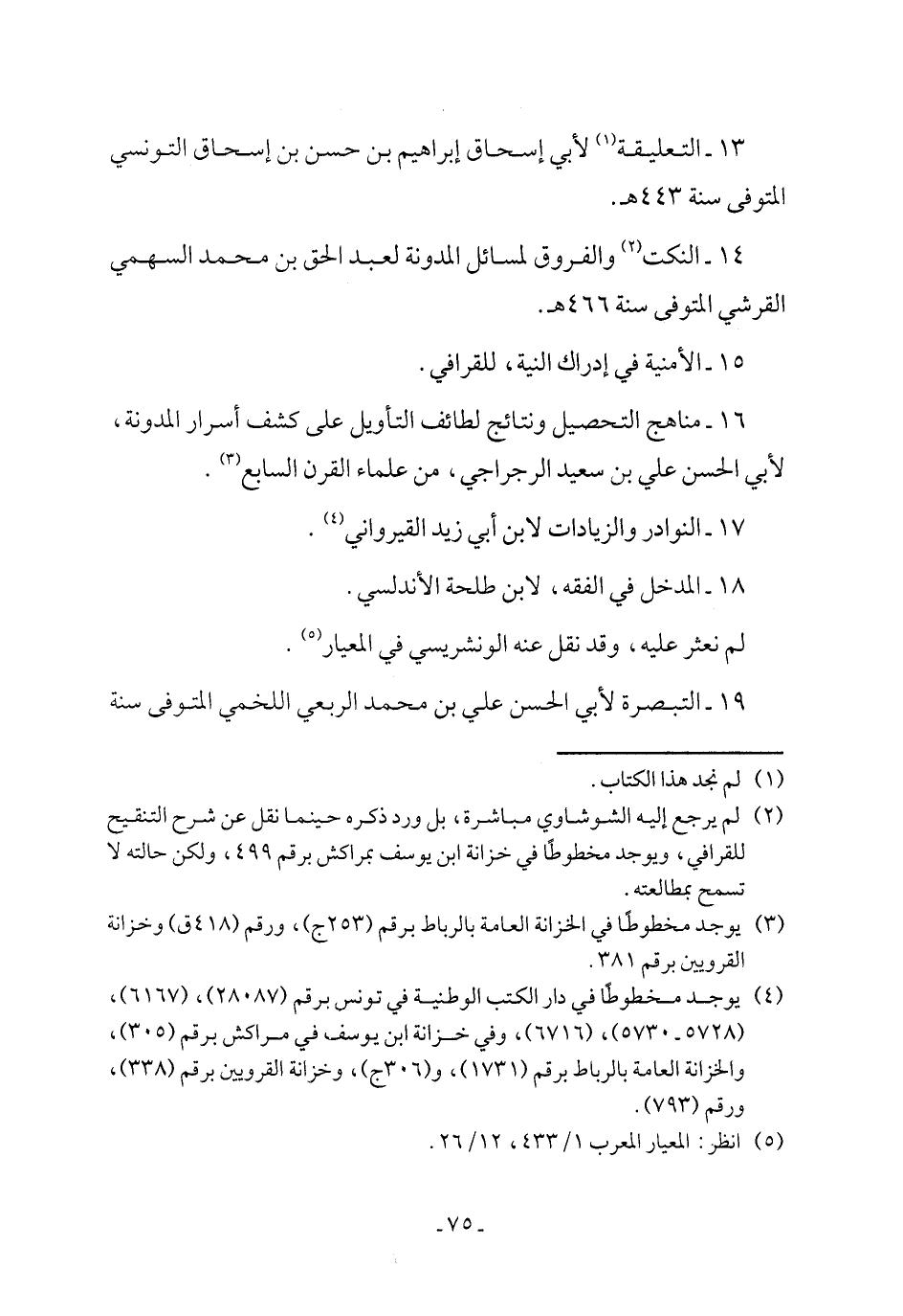 (¬2) لم يرجع إليه الشوشاوي مباشرة، بل ورد ذكره حينما نقل عن شرح التنقيح للقرافي، ويوجد مخطوطاً في خزانة ابن يوسف بمراكش برقم 499، ولكن حالته لا تسمح بمطالعته.
