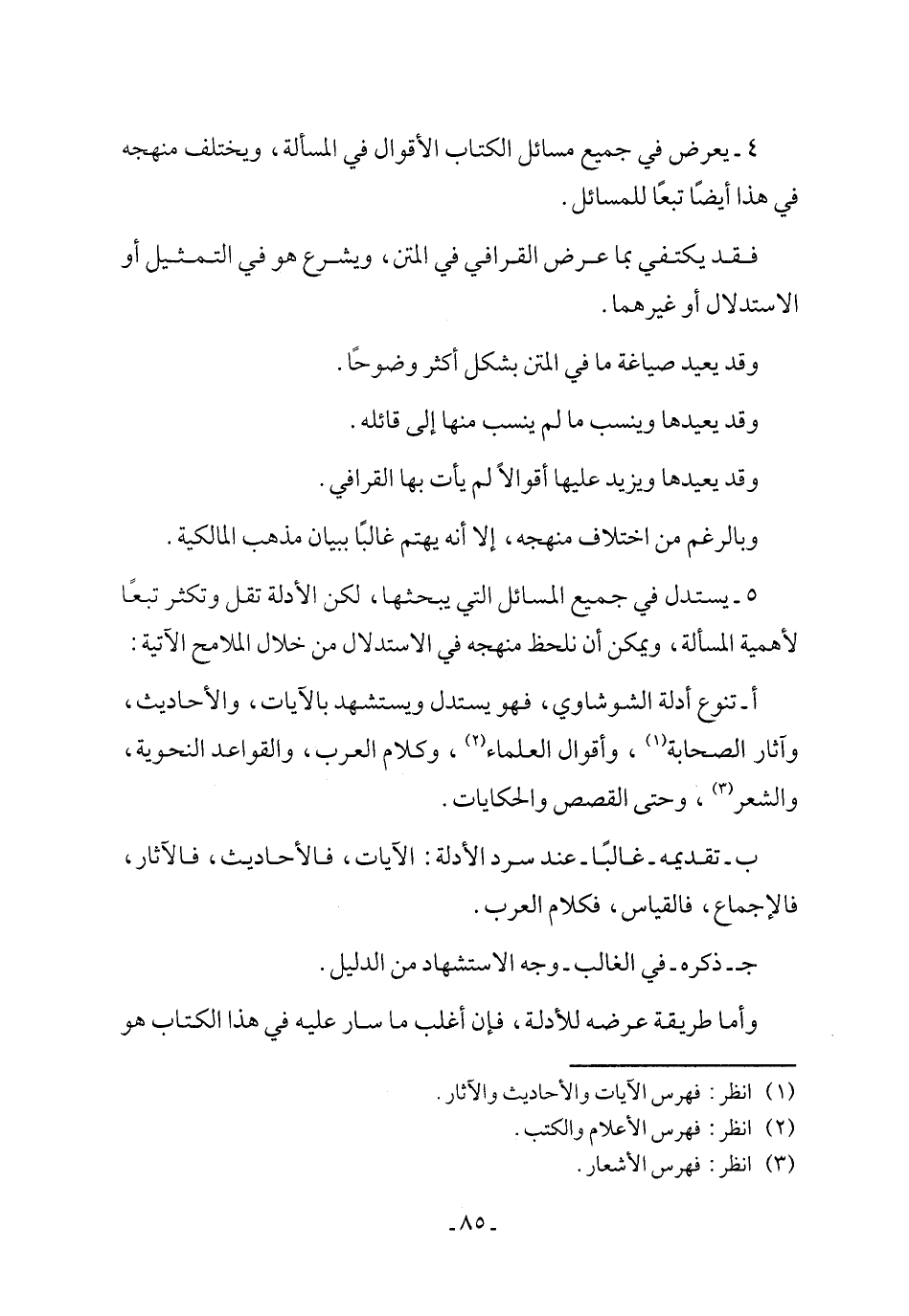 5 - يستدل في جميع المسائل التي يبحثها، لكن الأدلة تقل وتكثر تبعاً لأهمية المسألة، ويمكن أن نلحظ منهجه في الاستدلال من خلال الملامح الآتية: