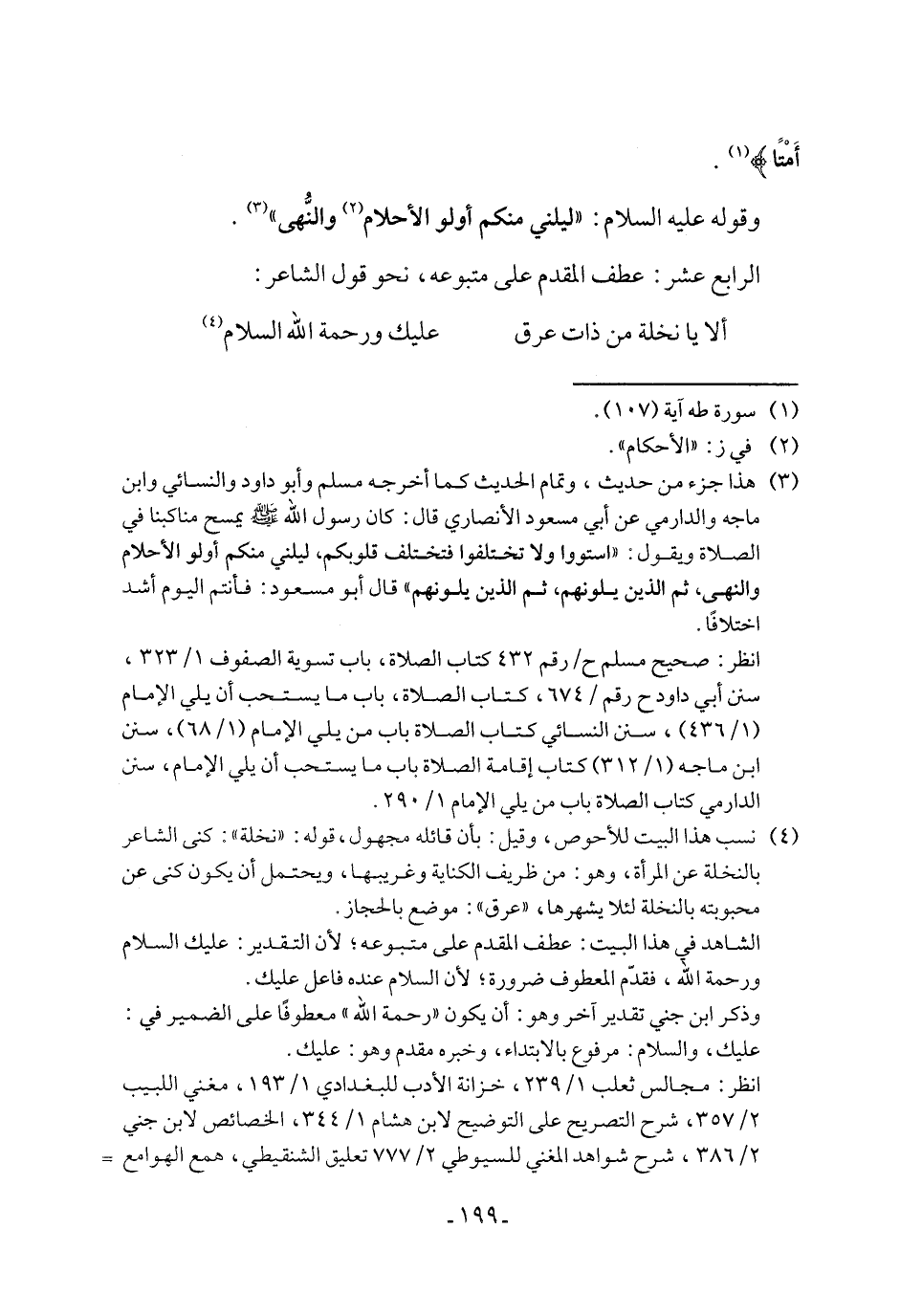 (¬3) هذا جزء من حديث، وتمام الحديث كما أخرجه مسلم وأبو داود والنسائي وابن ماجه والدارمي عن أبي مسعود الأنصاري قال: كان رسول الله - صلى الله عليه وسلم - يمسح مناكبنا في الصلاة ويقول: "استووا ولا تختلفوا فتختلف قلوبكم، ليلني منكم أولو الأحلام والنهى، ثم الذين يلونهم، ثم الذين يلونهم" قال أبو مسعود: فأنتم اليوم أشد اختلافًا.