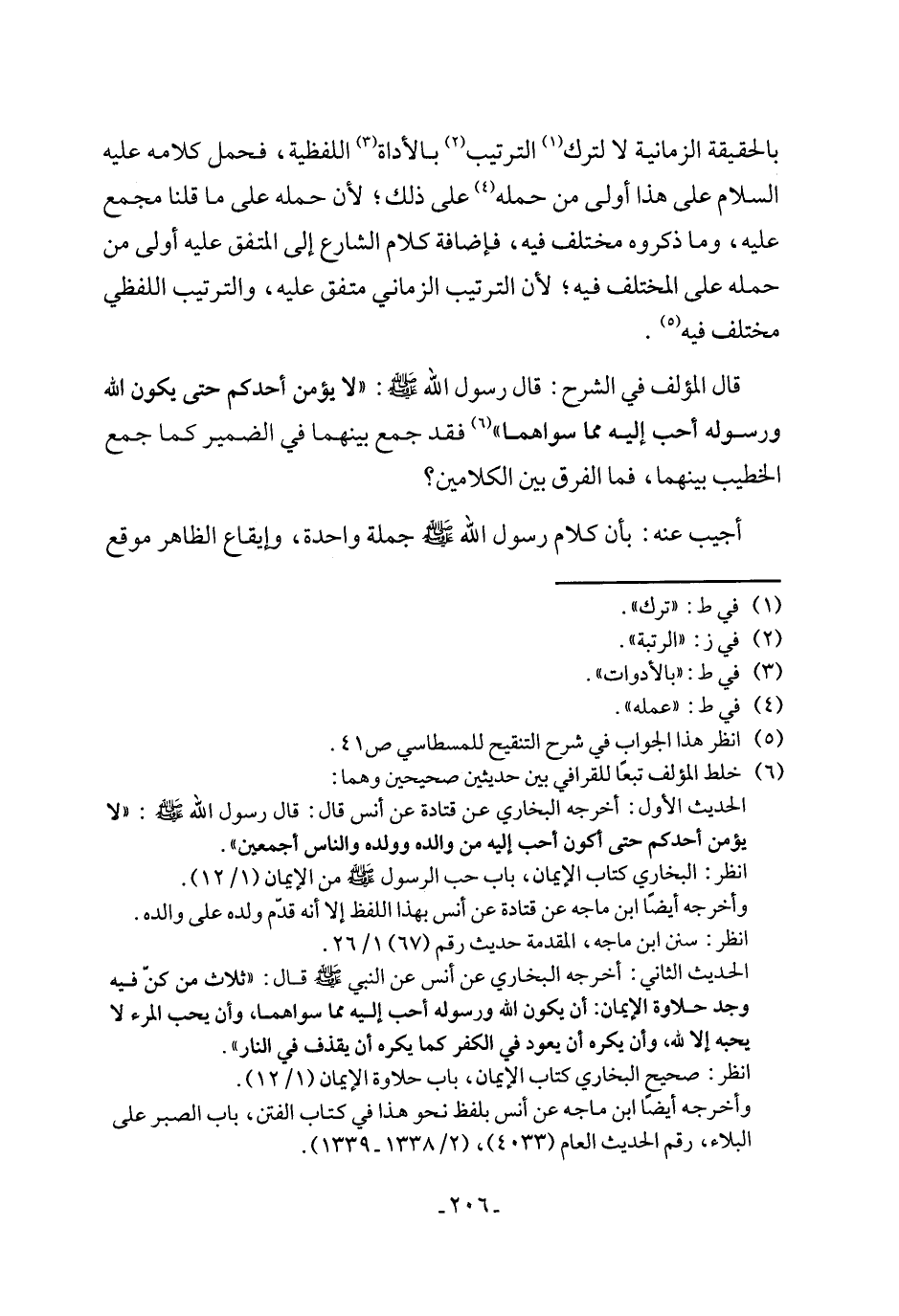 قال المؤلف في الشرح: قال رسول الله - صلى الله عليه وسلم -: "لا يؤمن أحدكم حتى يكون الله ورسوله أحب إليه مما سواهما" (¬6) فقد جمع بينهما في الضمير كما جمع الخطيب بينهما، فما الفرق بين الكلامين؟
