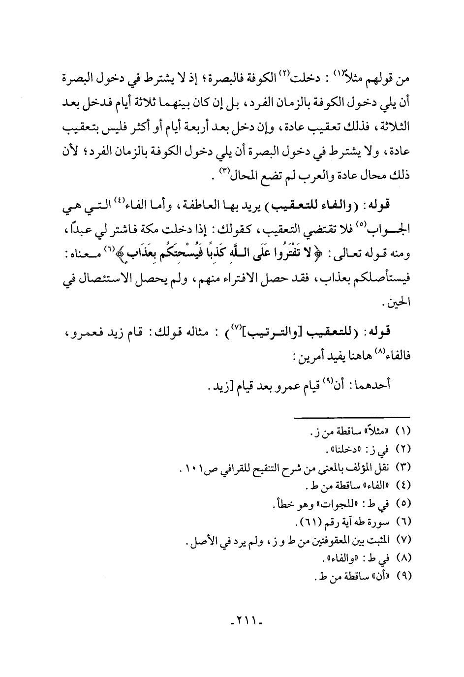 من قولهم مثلاً (¬1): دخلت (¬2) الكوفة فالبصرة؛ إذ لا يشترط في دخول البصرة أن يلي دخول الكوفة بالزمان الفرد، بل إن كان بينهما ثلاثة أيام فدخل بعد الثلاثة، فذلك تعقيب عادة، وإن دخل بعد أربعة أيام أو أكثر فليس بتعقيب عادة، ولا يشترط في دخول البصرة أن يلي دخول الكوفة بالزمان الفرد؛ لأن ذلك محال عادة والعرب لم تضع المحال (¬3).