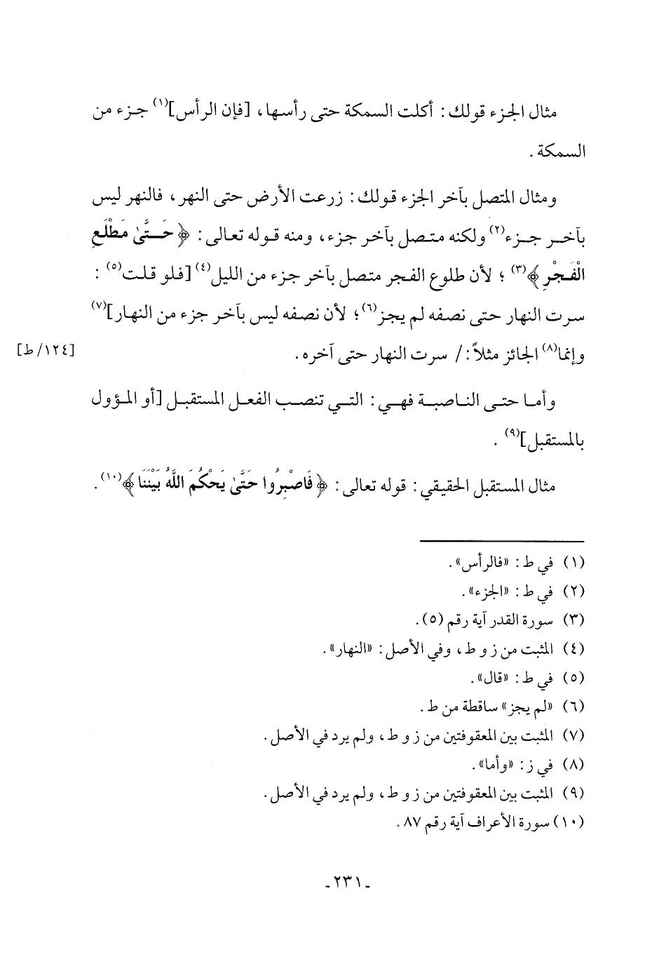 ومثال المتصل بآخر الجزء قولك: زرعت الأرض حتى النهر، فالنهر ليس بآخر جزء (¬2) ولكنه متصل بآخر جزء، ومنه قوله تعالى: {حَتَّى مَطْلَعِ الفجْرِ} (¬3)؛ لأن طلوع الفجر متصل بآخر جزء من الليل (¬4) [فلو قلت (¬5): سرت النهار حتى نصفه لم يجز (¬6)؛ لأن نصفه ليس بآخر جزء من النهار] (¬7) وإنما (¬8) الجائز مثلاً: سرت النهار حتى آخره.