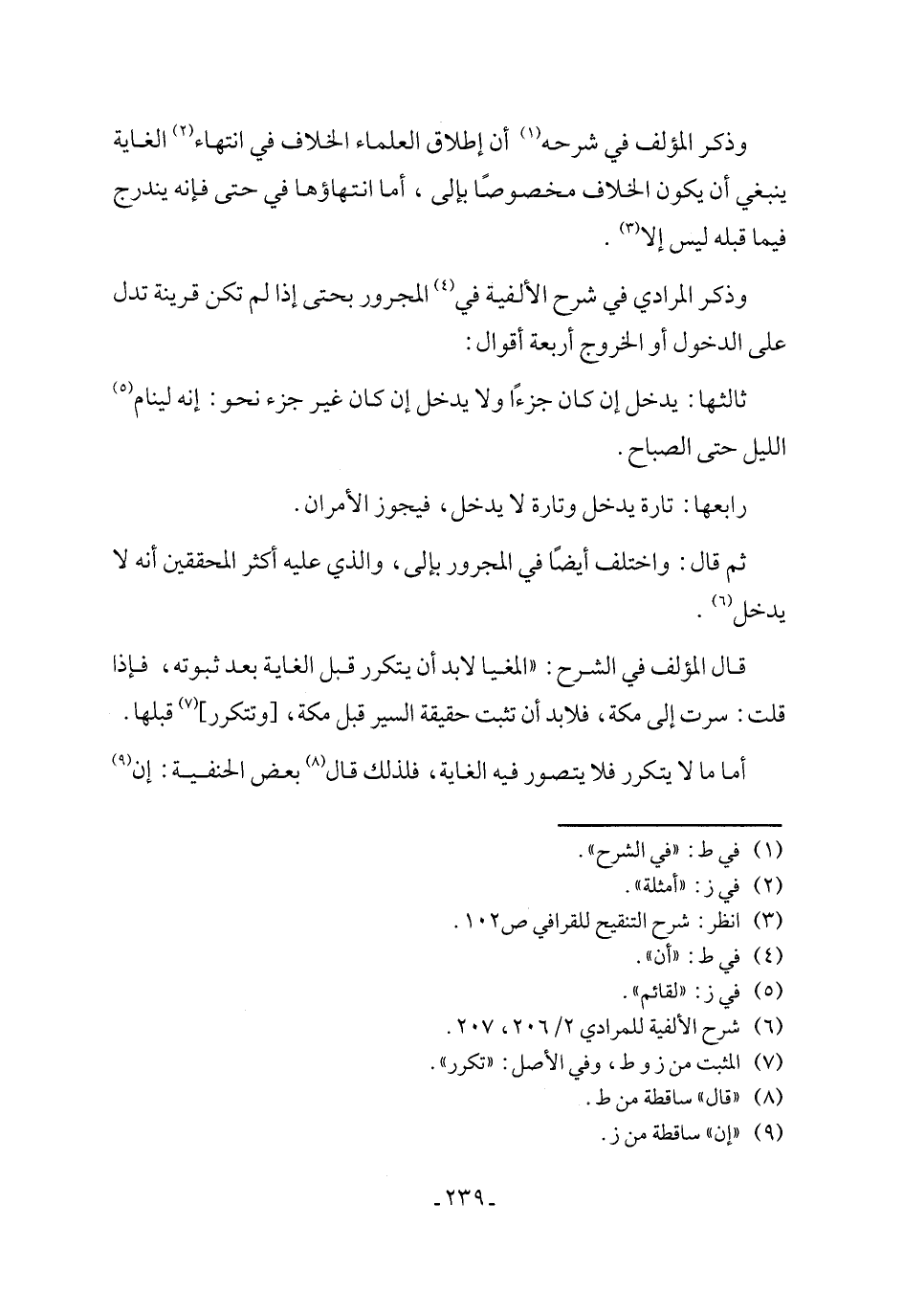 وذكر المؤلف في شرحه (¬1) أن إطلاق العلماء الخلاف في انتهاء (¬2) الغاية ينبغي أن يكون الخلاف مخصوصًا بإلى، أما انتهاؤها في حتى فإنه يندرج فيما قبله ليس إلا (¬3).