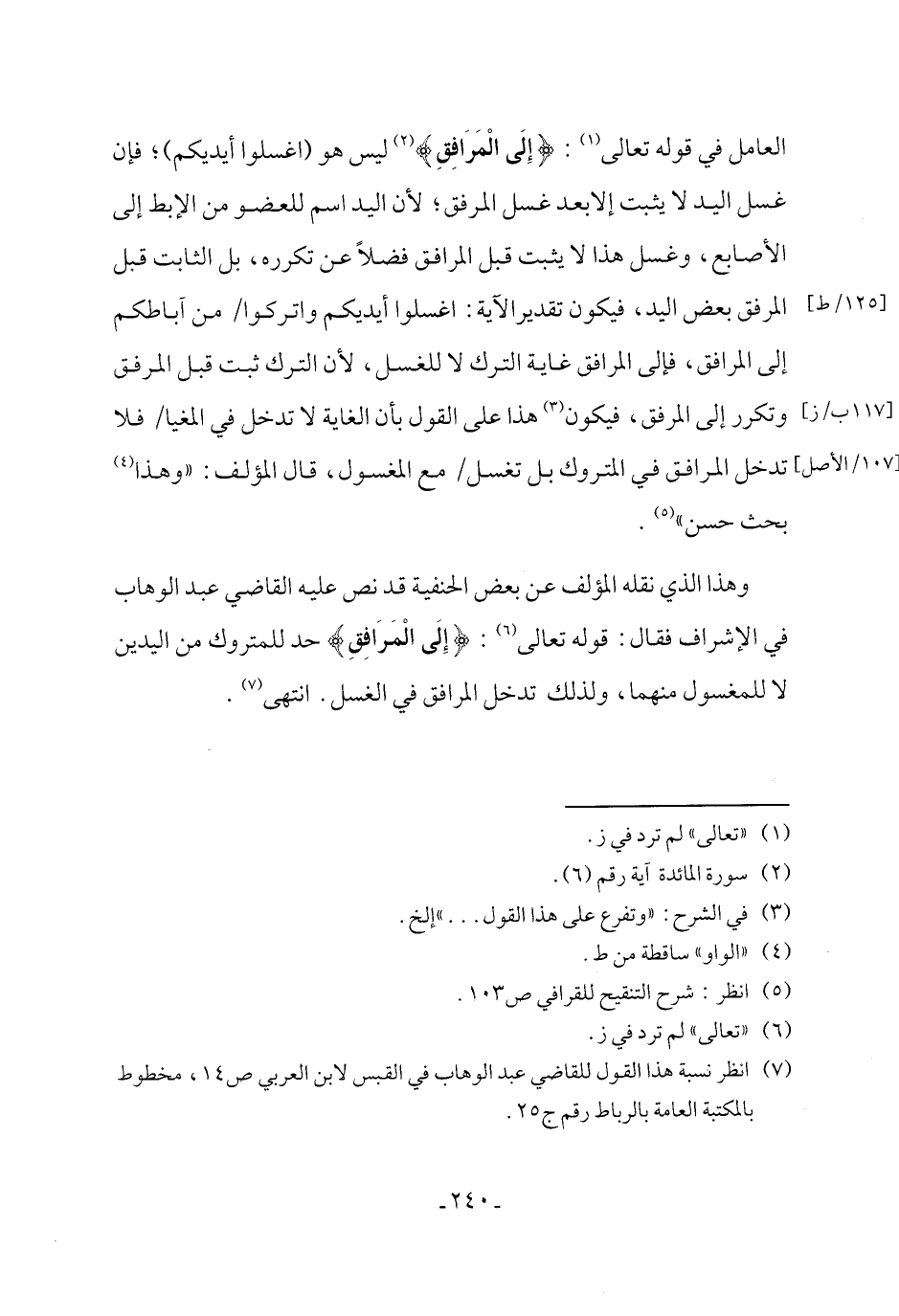 وهذا الذي نقله المؤلف عن بعض الحنفية قد نص عليه القاضي عبد الوهاب في الإشراف فقال: قوله تعالى (¬6): {إِلَى الْمَرَافِقِ} حد للمتروك من اليدين لا للمغسول منهما، ولذلك تدخل المرافق في الغسل. انتهى (¬7).