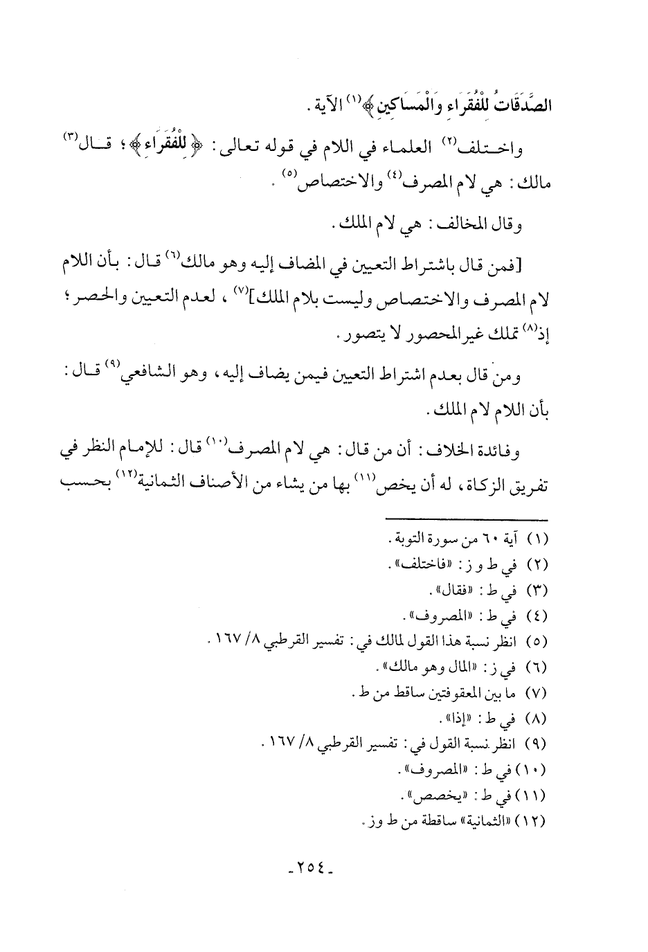 وفائدة الخلاف: أن من قال: هي لام المصرف (¬10) قال: للإمام النظر في تفريق الزكاة، له أن يخص (¬11) لها من يشاء من الأصناف الثمانية (¬12) بحسب