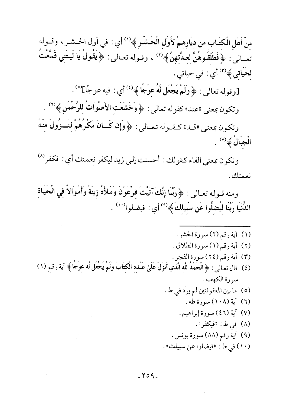 مِنْ أَهْلِ الْكِتَابِ مِنْ دِيَارِهِمْ لِأَوَّلِ الْحَشْر} (¬1) أي: في أول الحشر، وقوله تعالى: {فَطَلِّقُوهُنَّ لِعِدَّتِهِنّ} (¬2)، وقوله تعالى: {يَقُولُ يَالَيْتَنِي قَدَّمْتُ لِحَيَاتِي} (¬3) أي: في حياتي.